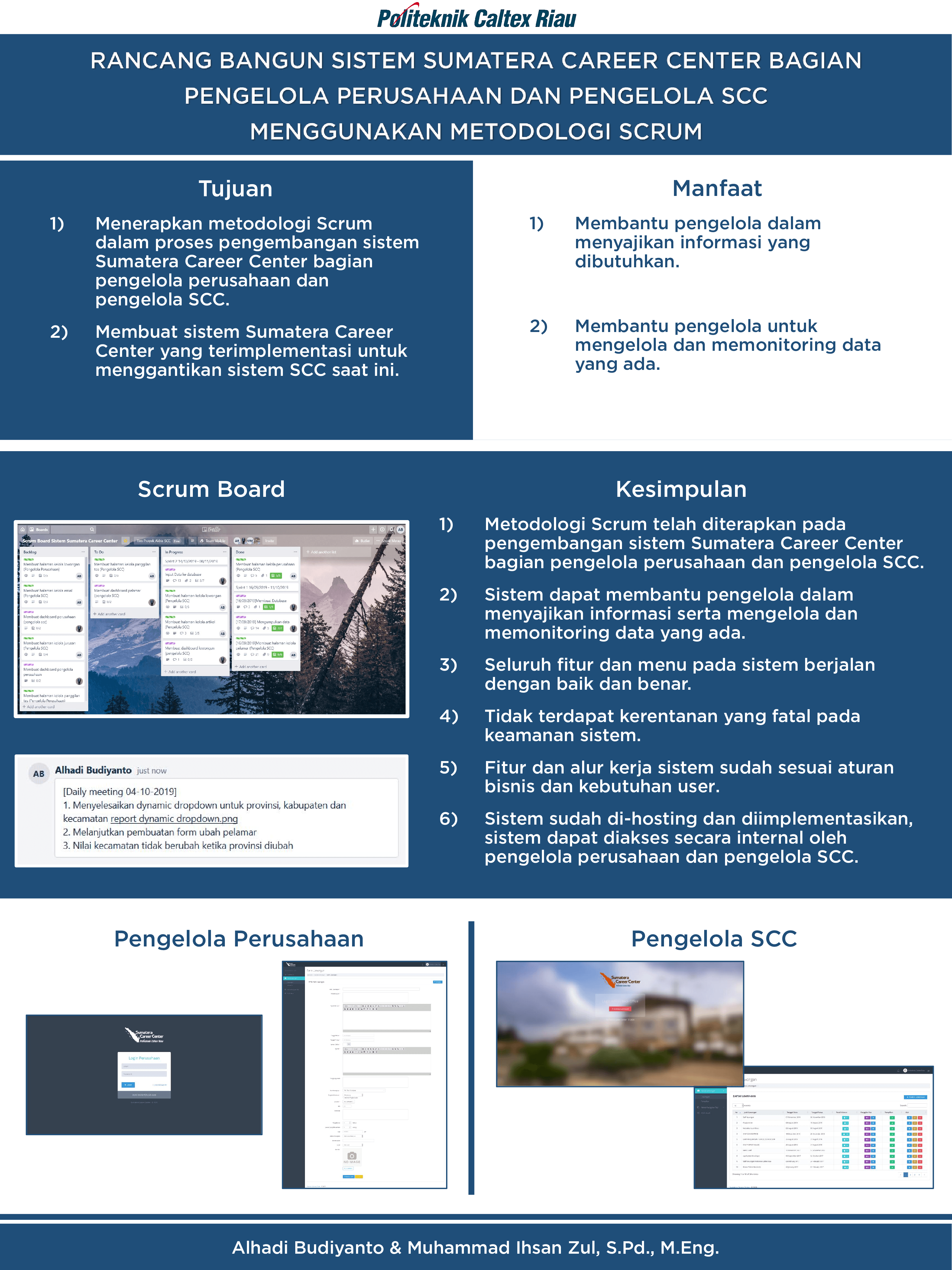 Sumatera Career Center (SCC) merupakan pusat career center yang dimiliki oleh Kampus Politeknik Caltex Riau yang bertujuan untuk menjadi pusat karir yang lengkap dan terpercaya bagi alumni dan pencari kerja maupun perusahaan. Tujuan dari penelitian ini adalah mengembangkan sistem SCC bagian pengelola perusahaan dan pengelola SCC menggunakan metodologi scrum yang dapat menggantikan sistem SCC sebelumnya. Penelitian ini menghasilkan sistem Sumatera Career Center bagian pengelola perusahaan dan pengelola SCC yang dikembangkan menggunakan Scrum. Seluruh backlog pada Scrum berhasil diselesaikan dalam 4 sprint dengan kurun waktu 4 bulan. Tool trello dapat membantu dalam dokumentasi harian Scrum. Sistem telah dikembangkan memiliki fitur yang berjalan dengan baik dan sesuai dengan alur proses bisnis Sumatera Career Center serta dari segi keamanan, sistem ini tidak memiliki kerentanan yang fatal. Sistem yang dikembangkan dapat membantu pengelola dalam menyajikan informasi serta mengelola dan memonitoring data yang ada.
