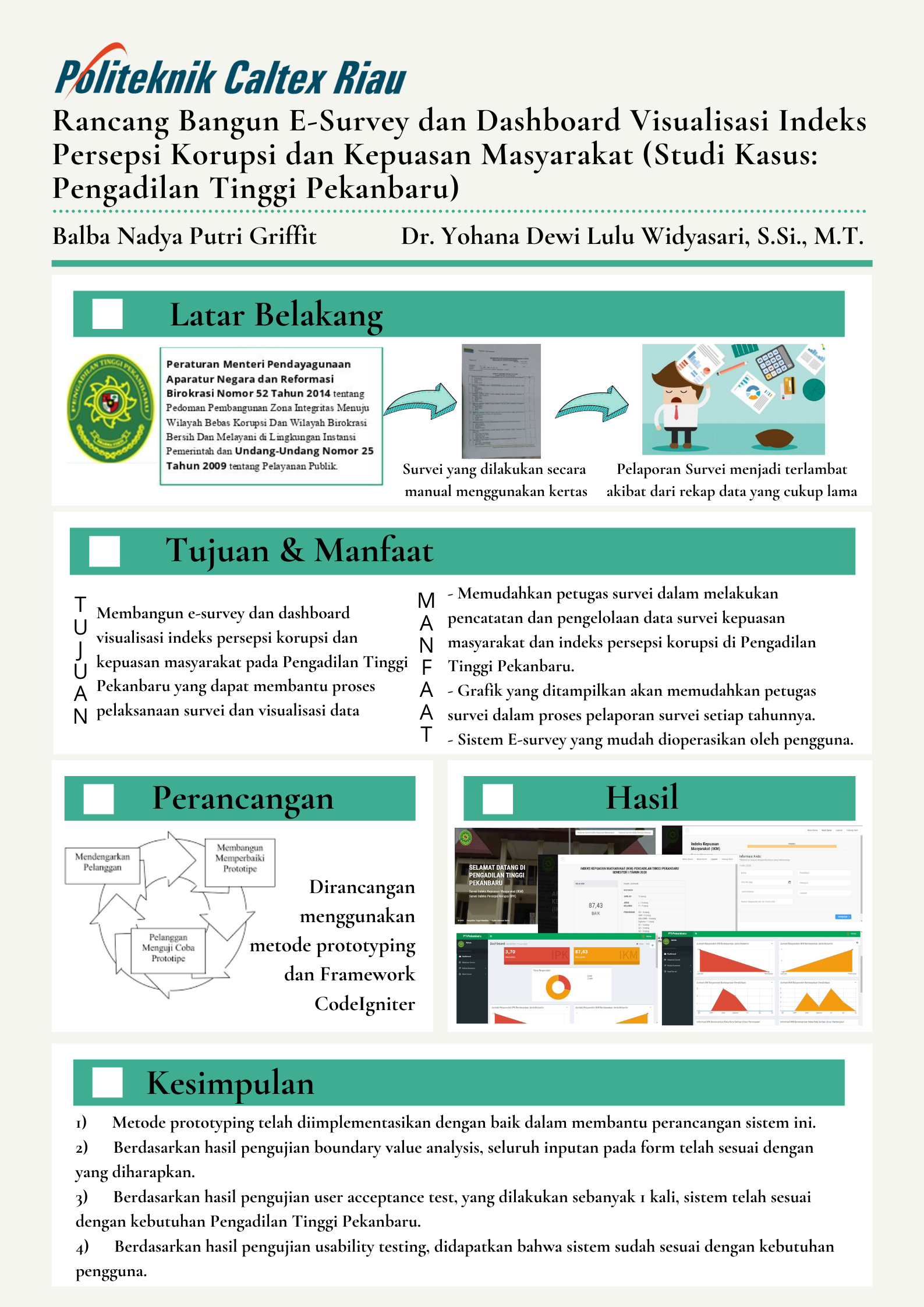 Pengadilan Tinggi Pekanbaru merupakan salah satu institusi penegak hukum di Indonesia. Pengadilan Tinggi Pekanbaru wajib melakukan Survei Indeks Persepsi Korupsi (IPK) dan Survei Indeks Kepuasan Masyarakat (IKM). Survei tersebut bertujuan sebagai tolak ukur dalam menilai tingkat korupsi dan kualitas pelayanan yang telah diberikan. Survei IPK dan IKM ini dilakukan dengan menggunakan kertas kuesioner, dan diolah menggunakan perangkat lunak Microsoft Excel. Hal ini tidak efisien karena menyebabkan proses rekap data menjadi sangat lama dan kesalahan dalam penginputan yang menyebabkan tidak akuratnya nilai indek. Kelalaian petugas dalam mengarsipkan lembar kuesioner juga sering terjadi. Lembar kuesioner yang telah terisi sering hilang ataupun rusak. Hal ini akan mempersulit proses pelaporan. Oleh karena itu dibangun sistem e-survey dan dashboard visualisasi data dalam bentuk grafik dan tabel agar membantu proses pelaporan. Sistem ini dapat membantu proses pencatatan, perhitungan serta pelaporan survei IPK dan IKM. Sistem ini juga dibangun menggunakan framework CodeIgniter dan metode prototyping dengan 2 kali Iterasi. Berdasarkan hasil pengujian boundary value analysis di dapatkan kesimpulan bahwa dari 37/37 skenario uji, seluruh form inputan sudah sesuai dengan format sistem. Hasil pengujian usability melalui 20 responden dinyatakan sistem tersebut layak digunakan. Kemudian pada pengujian user acceptance test yang dilakukan sebanyak 1 kali, didapatkan kesimpulan bahwa seluruh fungsional sistem telah berjalan sesuai dengan yang diharapkan.