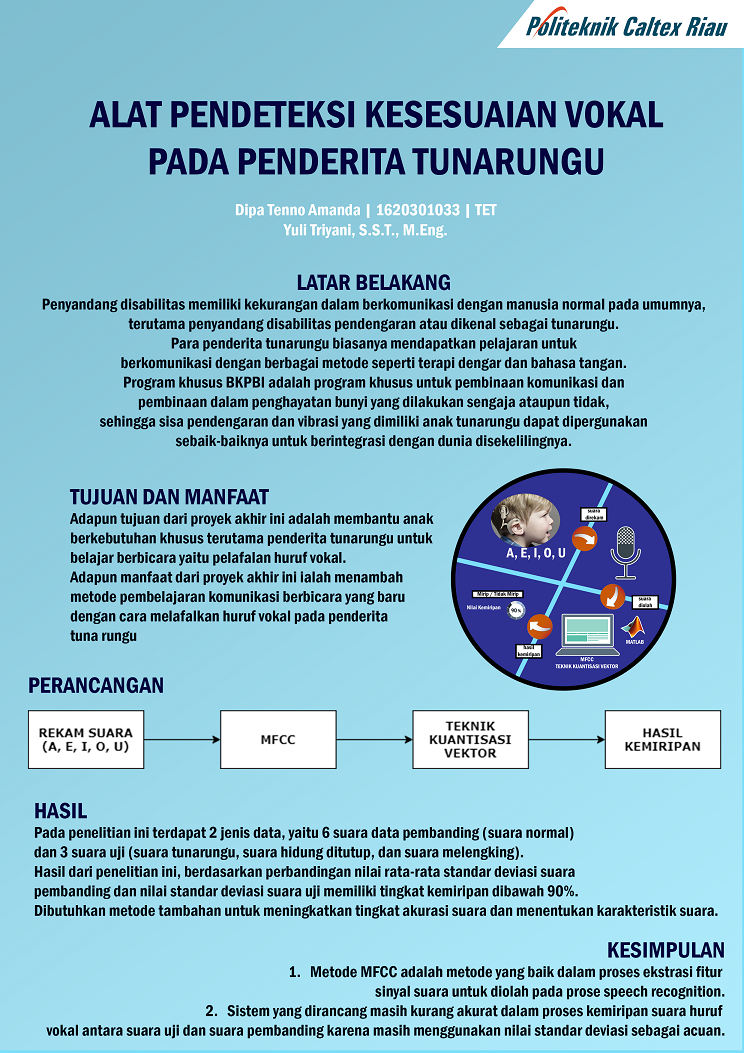 Penyandang disabilitas tunarungu memiliki kekurangan dalam melafalkan huruf vokal (A, E, I, O, dan U). Program BKPBI dan Speech Recognition dapat membantu penderita belajar untuk melafalkan huruf vokal dengan implementasi sistem dari Matlab dan Graphical User Interface (GUI). Metode Speech Recognition yang digunakan adalah Ekstrasi Ciri Mel Frequency Cepstrum Coefficient (MFCC) dan Teknik Kuantisasi Vektor. Dari metode ini, sinyal suara (input) diproses untuk mendapatkan filterbank mel-frequency lalu menghasilkan cepstrum sinyal dan disimpan dalam bentuk codebook. Nilai codebook ini berupa nilai vektor yang selanjutnya dihitung standar deviasinya untuk mendapatkan nilai kemiripan. Pada penelitian ini terdapat 2 jenis data, yaitu 6 suara data pembanding (suara normal) dan 3 suara uji (suara tunarungu, suara hidung ditutup, dan suara melengking). Hasil dari penelitian ini, berdasarkan perbandingan nilai rata-rata standar deviasi suara pembanding dan nilai standar deviasi suara uji memiliki tingkat kemiripan dibawah 90%. Dibutuhkan metode tambahan untuk meningkatkan tingkat akurasi suara dan menentukan karakteristik suara.