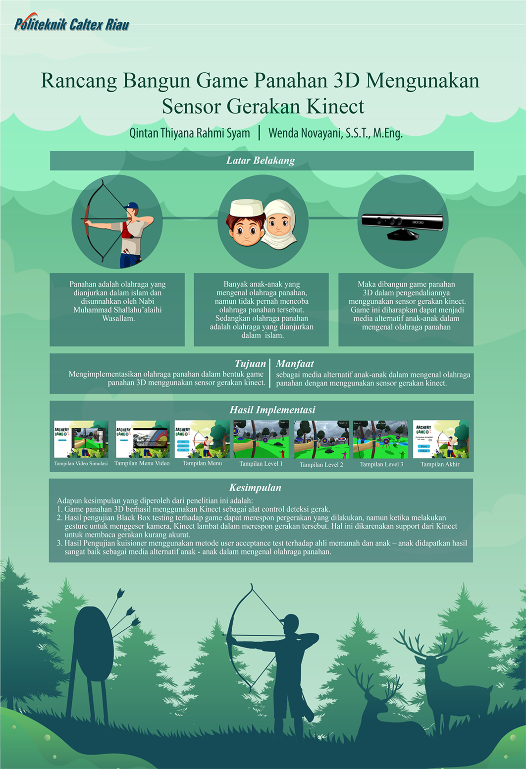 Panahan adalah ¬olahraga yang dianjurkan dalam Islam dan disunnahkan oleh Nabi Muhammad Shallahu’alaihi Wasallam. Berdasarkan hasil kuisioner terhadap 15 orang anak - anak menyatakan bahwa mengetahui olahraga panahan, namun tidak pernah mencoba olahraga tersebut. Sedangkan olahraga panahan adalah olahraga yang dianjurkan dalam islam. Maka dari itu, telah dirancang sebuah game panahan 3d menggunakan sensor gerakan Kinect. Game ini membutuhkan gerakan dasar dalam memanah, seperti menarik dan melepas anak panah sebagai input controllernya agar dapat berinteraksi dengan Kinect. Pada pengujian yang dilakukan dengan menggunakan Black Box Testing, game dapat merespon pergerakan yang dilakukan, namun ketika melakukan gesture untuk menggeser kamera, Kinect lambat dalam merespon gerakan tersebut. Hal ini di pengaruhi oleh sensor Kinect yang kurang akurat dalam membaca gerakan. Lalu, pada pengujian User Acceptance Test, dengan melakukan penyebaran kuisioner kepada ahli memanah dan anak – anak didapatkan hasil sangat baik game panahan 3d sebagai media alternatif anak – anak dalam mengenal olahraga panahan.