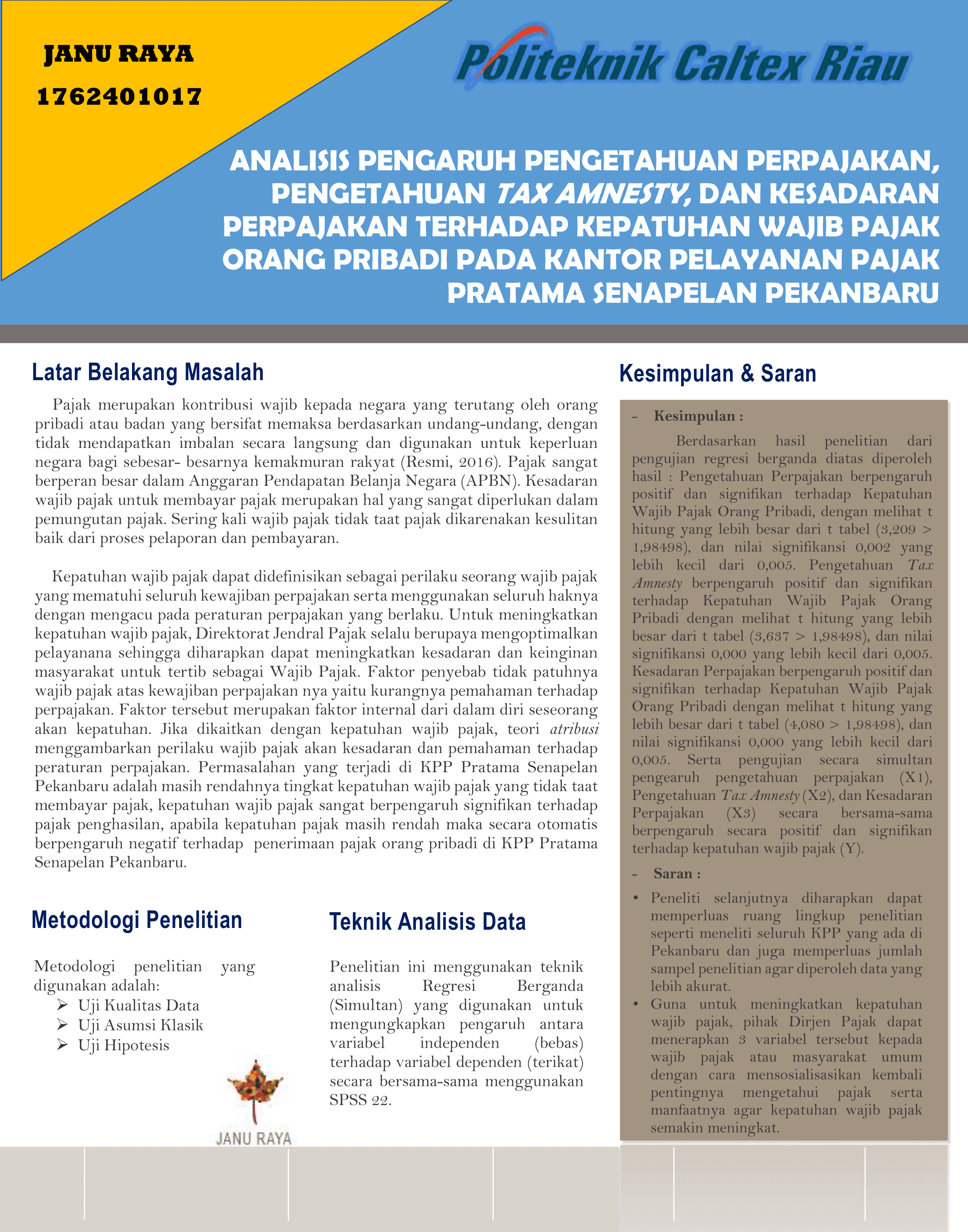 Analisis Pengaruh Pengetahuan Perpajakan, Pengetahuan Tax Amnesty, dan Kesadaran Perpajakan Terhadap Kepatuhan Wajib Pajak Orang Pribadi Pada Kantor Pelayanan Pajak Pratama Senapelan Pekanbaru