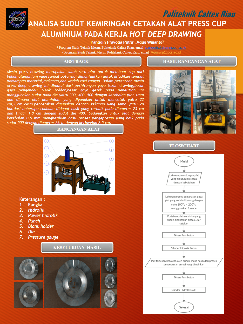 ABSTARAK Mesin press drawing merupakan salah satu alat untuk membuat cup dari bahan alumunium yang sangat potensial dimanfaatkan untuk dijadikan tempat penyimpan material,makanan,dan wadah cuci tangan. Dalam perencaan mesin press deep drawing ini dimulai dari perhitungan gaya tekan drawing,besar gaya pengendali blank holder,besar gaya gesek pada penelitian ini menggunakan sudut pada die yaitu 300, 400, 500 dengan ketebalan plat 1mm dan dimana plat aluminium yang digunakan untuk mencetak yaitu 22 cm,23cm,24cm.pencetakan digunakan dengan tekanan yang sama yaitu 20 bar.dari beberapa coabaan didapat hasil yang terbaik pada diameter 23 cm dan tinggi 1,8 cm dengan sudut die 400. Sedangkan untuk plat dengan ketebalan 0,5 mm menghasilkan hasil proses pengepresan yang baik pada sudut 500 dengan diameter 23cm dengan ketinggian 2,5 cm Kata kunci: Power pack hydraulic, plat aluminum, punch dan die,diberikan perlakuan panas pada plat aluminium 100oc – 200oc
