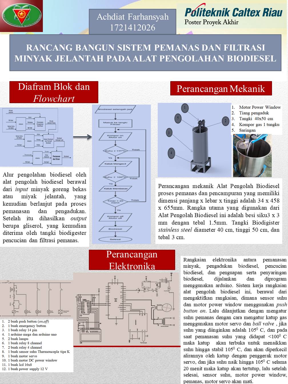 Biodiesel adalah bahan bakar yang terbuat dari minyak nabati yang dapat diperoleh dari tumbuh-tumbuhan. Penelitian ini bertujuan untuk merealisasikan suatu prototipe alat pengolahan biodiesel yang dapat bekerja secara semi otomatis dengan modul arduino sebagai elemen kendalinya. Proses pengolahan terbagi empat tahap yaitu proses pemanasan tangki transesterifikasi, proses transesterifikasi, proses pendingin , proses filtrasi dan pemanas. Di mulai dengan masuk nya minyak ke tangki lalu di saring dengan penyaring setelah itu kompor dan pengaduk menyala hingga suhu mencapai 1050C, api kompor akan mengecil apabila suhu sudah mencapai 1050C. Jika suhu kurang dari 1000C maka api kompor akan kembali membesar, proses ini terus terus berlangsung hingga 20 menit. Keluaran dari proses ini adalah 6,2 liter untuk 10 liter minyak jelantah, 10,7 liter untuk pengolahan 15 liter minyak jelantah dan 14,5 liter untuk pengolahan 20 liter minyak jelantah.