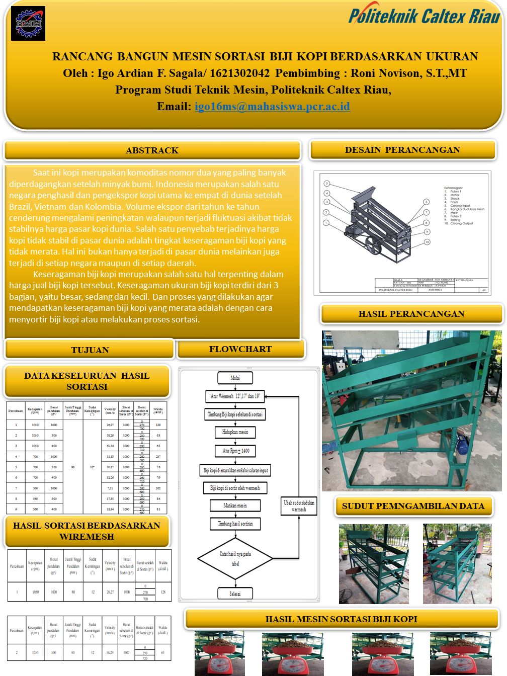 Keseragaman biji kopi merupakan salah satu hal terpenting dalam harga jual biji kopi tersebut. Keseragaman ukuran biji kopi terdiri dari 3 bagian, yaitu besar, sedang dan kecil. Dan proses yang dilakukan agar mendapatkan keseragaman biji kopi yang merata adalah dengan cara menyortir biji kopi atau melakukan proses sortasi. Mesin penyortir biji kopi yang akan dibuat menggunakan penggerak utama yaitu motor listrik 2Hp, sudut penyortiran dengan wermesh adalah 12°,17°,19° sistem penyortiran yang digunakan yaitu sistem getaran agar hasil ayakan hasil di dapat bisa lebih baik dan lebih cepat. Pada Mesin penyortir biji kopi ini dilakukan penelitian yaitu Rancang Bangun Mesin Sortasi Biji Kopi Berdasarkan Ukuran. Tujuan penelitian ini adalah Mengayak biji kopi secara otomatis dan dapat mengirit dari segi waktu dan biaya. Setelah dilakukan pengujian pada saat penyortiran ukuran biji kopi liberika. Untuk hasil sortasi paling yang paling efektif menggunakan kecepatan putaran 1050rpm, berat pendulum 500gr, tinggi pendulum 80mm, dan kemiringan sudut 17°.