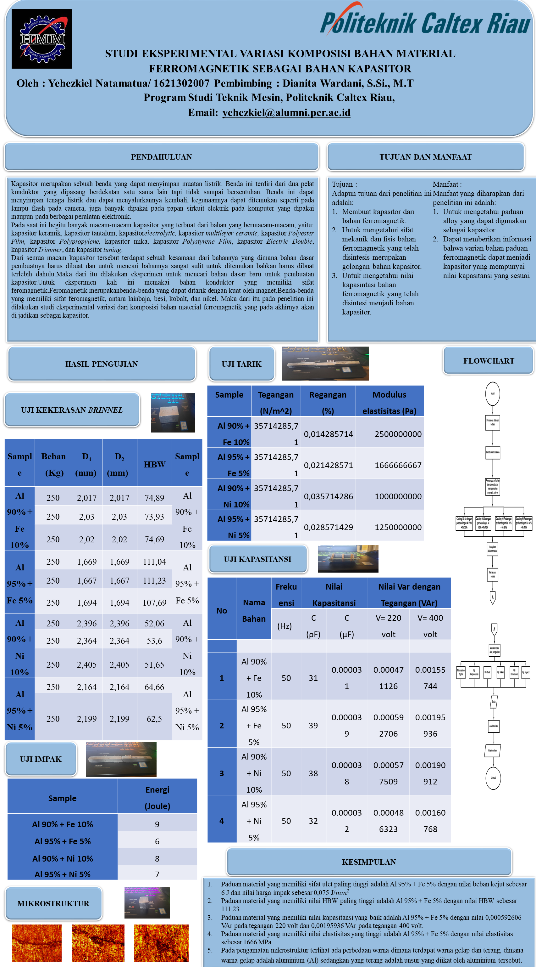 Kapasitor merupakan sebuah benda yang dapat menyimpan muatan listrik. Benda ini terdiri dari dua pelat konduktor yang dipasang berdekatan satu sama lain tapi tidak sampai bersentuhan. Uji eksperimental pembuatan kapasitor dengan menggunakan bahan-bahan yang memiliki sifat ferromagnetikakan dilakukan dengan cara menggabung dua unsur yang memiliki sifat ferromagnetik dengan menggunakan metode casting dan perlakuan panas. Unsur yang digunakan adalah aluminium (Al), nikel (Ni), dan Besi (Fe). Dari ketiga unsur tersebut akan dihasilkan Al-Ni (95%+5% dan 90%+10%) dan Al-Fe (95%+5% dan 90%+10%). Proses dilakukan dengan cara mencetak material sampel pada wadah yang telah dibuat, kemudian dilakukan dengan proses perlakuan panas yang dilakukan menggunakan mesin furnace yang terdapat di lab pengujian bahan. Setelah campuran tersebut jadi maka dilakukan pengujian dengan menggunakan alat uji tarik, uji impact, uji kekerasan, uji kapasitansi (Uji Cyclic Voltametrydan Uji Electrochemical Impedance Spectrocopy) dan morfologi permukaan dengan menggunakan mikroskop optik. Hasil beberapa pengujian didapat komposisi terbaik pada campuran Al 95% + Fe 5%. Nilai pengujian kapasitansi didapat sebesar 39 ÏF, nilai pengujian impak didapat sebesar 6 J, nilai pengujian kekerasan brinnel didapat sebesar 111,23, dan nilai pengujian tarik didapat sebesar 1666 MPa.