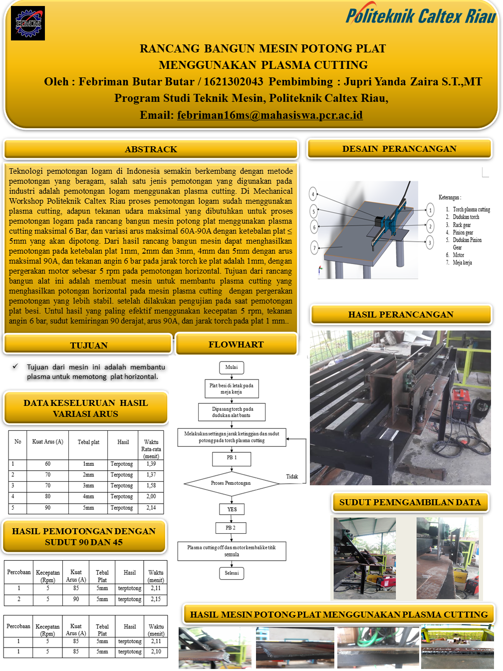Teknologi pemotongan logam di Indonesia semakin berkembang dengan metode pemotongan yang beragam, salah satu jenis pemotongan yang digunakan pada industri adalah pemotongan logam menggunakan plasma cutting. Di Mechanical Workshop Politeknik Caltex Riau proses pemotongan logam sudah menggunakan plasma cutting, adapun tekanan udara maksimal yang dibutuhkan untuk proses pemotongan logam pada rancang bangun mesin potong plat menggunakan plasma cutting maksimal 6 Bar, dan variasi arus maksimal 60A-90A dengan ketebalan plat ≤ 5mm yang akan dipotong. Pada kompresor yang dibutuhkan untuk rancang bangun mesin potong plat dengan kapasitas tekanan udara maksimal 12 Bar dengan daya 7,5 KW pada motor 3 phasa sebagai penggerak. Perencanaan pemotongan plat menggunakan rancang bangun mesin potong plat menggunakan plasma cutting digerakkan menggunakan motor listrik dengan perencanaan torsi 0,92Nm sebagai sumber penggerak, dan pergerakan yang di hasilkan searah sumbu horizontal (bolak balik). Dari hasil rancang bangun mesin dapat menghasilkan pemotongan pada ketebalan plat 1mm, 2mm dan 3mm dengan arus maksimal 70A, dan tekanan angin maksimal 4 bar pada jarak torch ke plat besi sebesar 1mm dengan pergerakan motor maksimal 10rpm pada pemotongan horizontal, sedangkan pada tebal plat 4mm dan 5mm dengan arus maksimal 90A, dan tekanan angin 6 bar pada jarak torch ke plat adalah 1mm, dengan pergerakan motor sebesar 5 rpm pada pemotongan horizontal. Tujuan dari rancang bangun alat ini adalah membuat mesin untuk membantu plasma cutting yang menghasilkan potongan horizontal pada mesin plasma cutting dengan pergerakan pemotongan yang lebih stabil. setelah dilakukan pengujian pada saat pemotongan plat besi. Untul hasil yang paling efektif menggunakan kecepatan 5 rpm, tekanan angin 6 bar, sudut kemiringan 90o, arus 90A, dan jarak torch pada plat 1 mm.