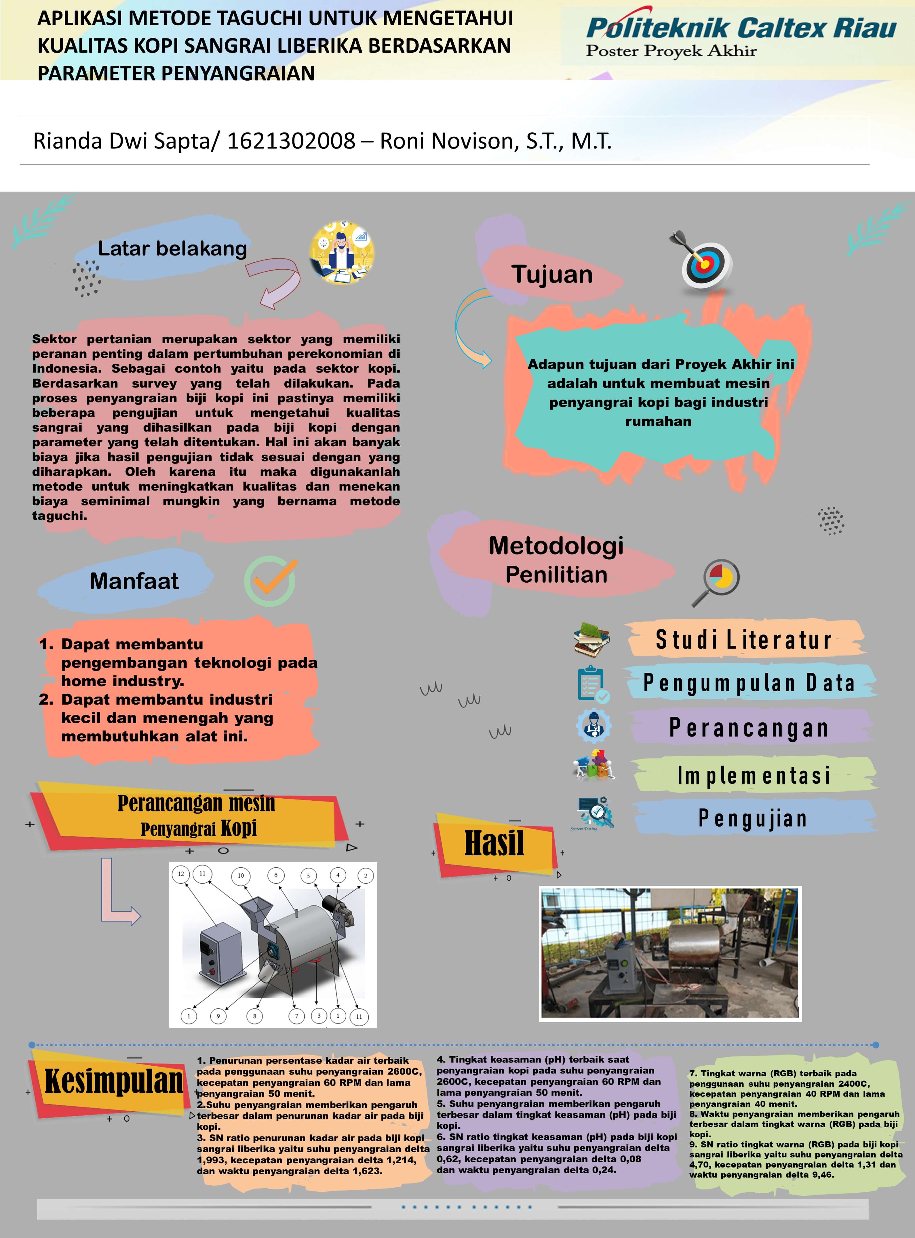 Saat ini masih terdapat beberapa proses dalam penyangraian kopi yang masih menggunakan cara tradisional menggunakan wajan yang terbuat dari besi sehingga membutuhkan waktu yang lama dalam menyangraianya dan juga kurang efisien karena panas yang dihasilkan kurang merata. Salah satu proses yang dilakukan untuk mempermudah proses penyangraian ini yaitu dengan membuat mesin penyangrai kopi menggunakan heater dan motor bertenaga listrik. Heater ini berfungsi untuk memanaskan ruang penyangraian sehingga panas yang didapat merata diseluruh ruang penyangraian. Juga ditambah pengaturan dalam suhu dan kecepatan motor sehingga cita rasa pada kopi lebih nikmat. Dalam proses penyangraian ini menggunakan metode taguchi agar pengambilan data lebih efisien dengan 9 kali percobaan bervariabel dimana suhu penyangraian sebesar 240℃, 250℃ dan 260℃. Waktu penyangraian 30 menit, 40 menit dan 50 menit. Kecepatan penyangraian di 20 RPM, 40 RPM dan 60 RPM. Dimana berdasarkan nilai SN ratio variabel 260℃, waktu penyangrain 60 menit dan kecepatan penyangraian 60 RPM menempati penyangraian terbaik pada pengurangan kadar air dan tingkat keasaman (pH).