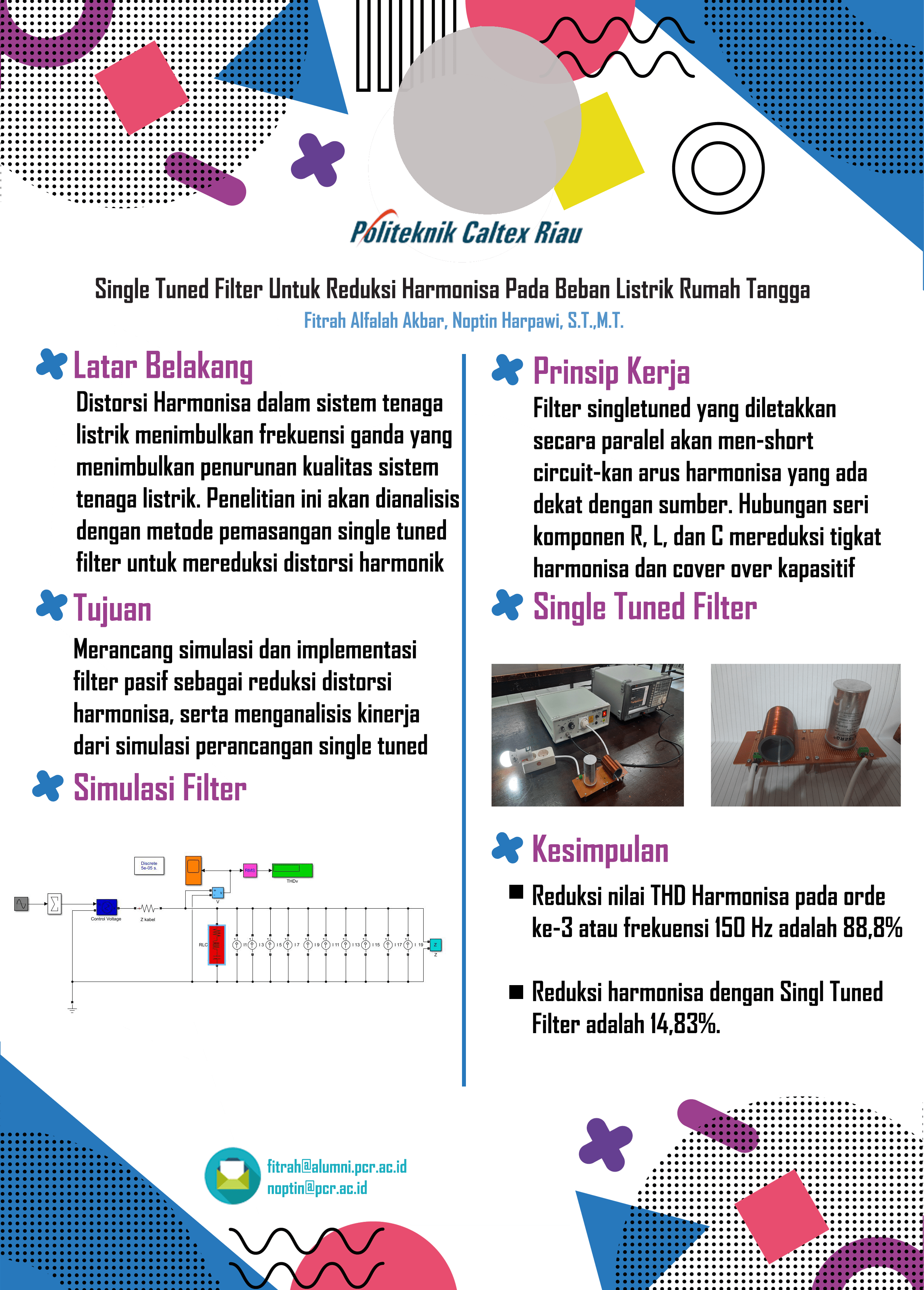 Tenaga listrik menjadi kebutuh mendasar manusia modern ini. Sektor perumahan merupakan salah satu pengguna tenaga listrik paling besar, beban-beban non linier umumnya menggunakan bahan semi konduktor pada komponennya, penggunaan bahan ini menimbulkan distorsi Harmonisa yang dapat merusak perangkat-perangkat elektronik dan mempersingkat usia perangkat, distorsi ini juga mempengaruhi kerja KWH Meter yang mengakibatkan penurunan kinerja dan kualitas daya listrik. Pada Proyek Akhir ini dirancang filter pasif single tuned melalui implementasi hasil simulasi Matlab Simulink untuk reduksi harmonisa pada beban listrik rumah tangga dengan komponen pasif yaitu resistor 2,2Ω, kapasitor 15μF, dan induktor 7,2 mH. Penurunan nilai THD pada orde ke-3 atau frekuensi 150 Hz adalah sebesar 88,8% setelah dipasang Single Tuned Filter, dengan reduksi harmonisa sebesar 14,83%.