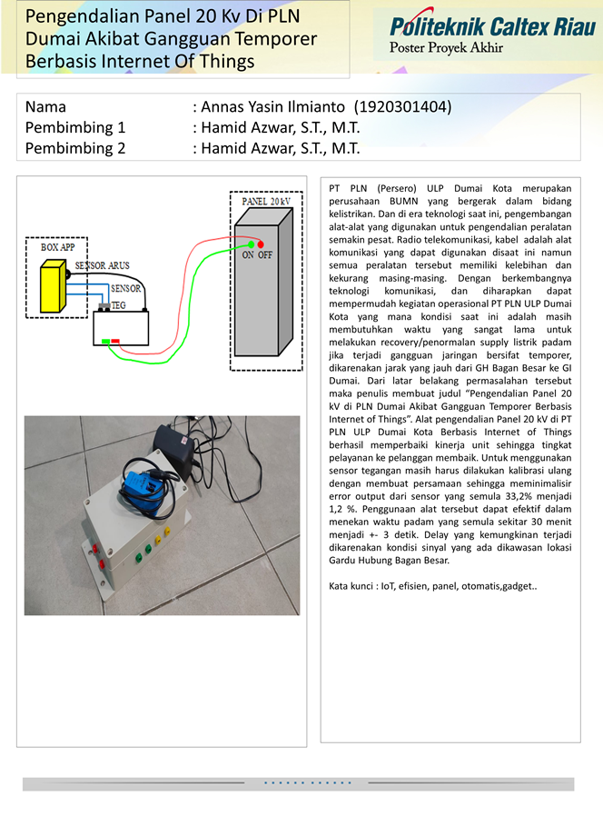PT PLN (Persero) ULP Dumai Kota merupakan perusahaan BUMN yang bergerak dalam bidang kelistrikan. Dan di era teknologi saat ini, pengembangan alat-alat yang digunakan untuk pengendalian peralatan semakin pesat. Radio telekomunikasi, kabel adalah alat komunikasi yang dapat digunakan disaat ini namun semua peralatan tersebut memiliki kelebihan dan kekurang masing-masing. Dengan berkembangnya teknologi komunikasi, dan diharapkan dapat mempermudah kegiatan operasional PT PLN ULP Dumai Kota yang mana kondisi saat ini adalah masih membutuhkan waktu yang sangat lama untuk melakukan recovery/penormalan supply listrik padam jika terjadi gangguan jaringan bersifat temporer, dikarenakan jarak yang jauh dari GH Bagan Besar ke GI Dumai. Dari latar belakang permasalahan tersebut maka penulis membuat judul “Pengendalian Panel 20 kV di PLN Dumai Akibat Gangguan Temporer Berbasis Internet of Thingsâ€. Alat pengendalian Panel 20 kV di PT PLN ULP Dumai Kota Berbasis Internet of Things berhasil memperbaiki kinerja unit sehingga tingkat pelayanan ke pelanggan membaik. Untuk menggunakan sensor tegangan masih harus dilakukan kalibrasi ulang dengan membuat persamaan sehingga meminimalisir error output dari sensor yang semula 33,2% menjadi 1,2 %. Penggunaan alat tersebut dapat efektif dalam menekan waktu padam yang semula sekitar 30 menit menjadi +- 3 detik. Delay yang kemungkinan terjadi dikarenakan kondisi sinyal yang ada dikawasan lokasi Gardu Hubung Bagan Besar.