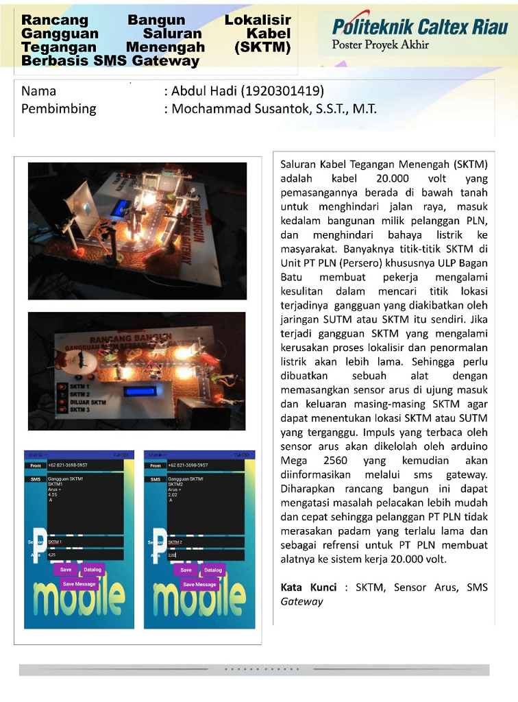 Saluran Kabel Tegangan Menengah (SKTM) adalah kabel 20.000 volt yang pemasangannya berada di bawah tanah untuk menghindari jalan raya, masuk kedalam bangunan milik pelanggan PLN, dan menghindari bahaya listrik ke masyarakat. Banyaknya titik-titik SKTM di Unit PT PLN (Persero) khususnya ULP Bagan Batu membuat pekerja mengalami kesulitan dalam mencari titik lokasi terjadinya gangguan yang diakibatkan oleh jaringan SUTM atau SKTM itu sendiri. Jika terjadi gangguan SKTM yang mengalami kerusakan proses lokalisir dan penormalan listrik akan lebih lama. Sehingga perlu dibuatkan sebuah alat dengan memasangkan sensor arus di ujung masuk dan keluaran masing-masing SKTM agar dapat menentukan lokasi SKTM atau SUTM yang terganggu. Impuls yang terbaca oleh sensor arus akan dikelolah oleh arduino Mega 2560 yang kemudian akan diinformasikan melalui sms gateway. Diharapkan rancang bangun ini dapat mengatasi masalah pelacakan lebih mudah dan cepat sehingga pelanggan PT PLN tidak merasakan padam yang terlalu lama dan sebagai refrensi untuk PT PLN membuat alatnya ke sistem kerja 20.000 volt.