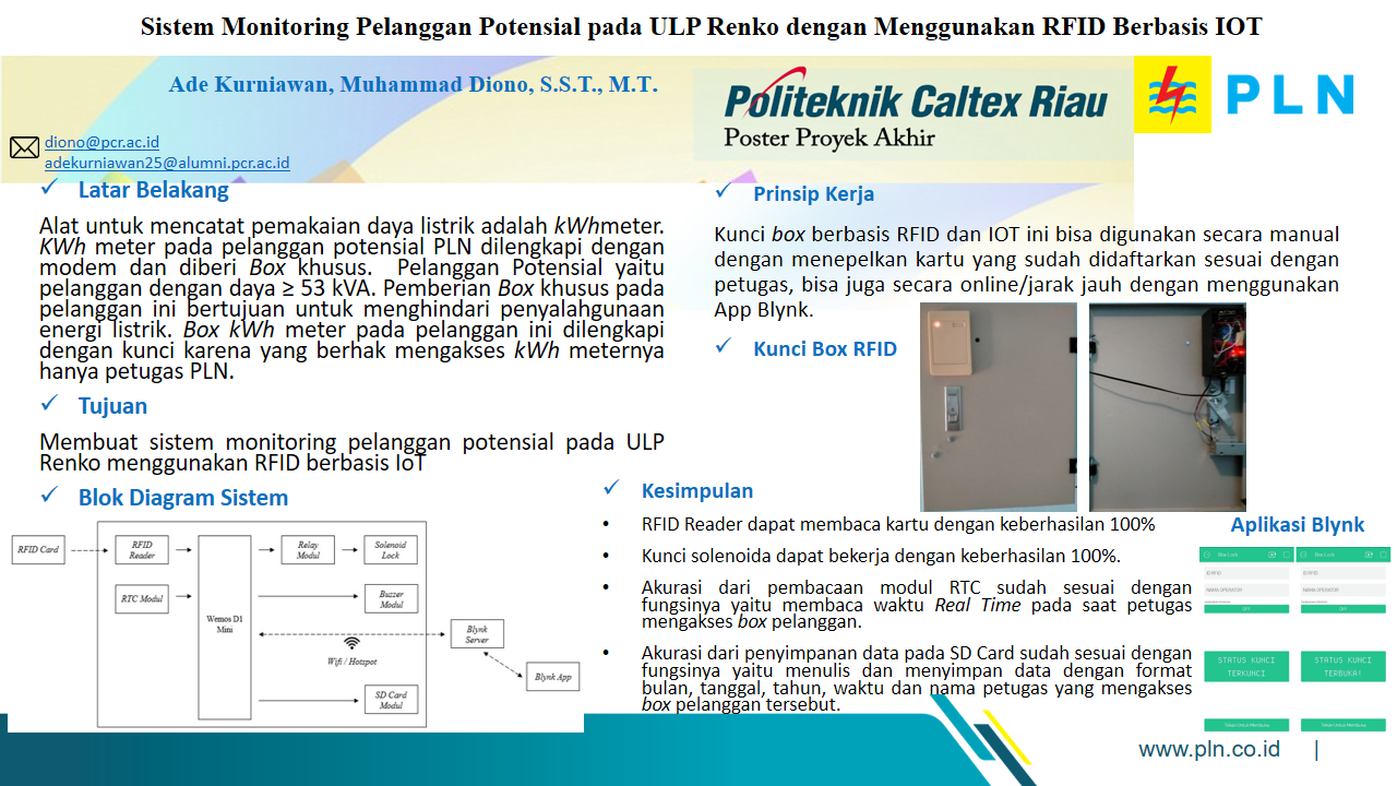 Pemakaian daya listrik PLN dicatat melalui kWhmeter. Pelanggan potensial, yaitu pelanggan dengan daya ≥ 53 kVA diberikan box khusus untuk penyimpanan kWhmeternya. Kunci box yang digunakan saat ini memiliki kelemahan dalam segi keamanan, yaitu mudah dibuka oleh orang yang tidak berwenang. Peneliti membuat kunci yang memiliki sistem keamanan yang lebih baik. Sistem ini dapat memonitor petugas yang mengakses box. Sistem memanfaatkan IoT untuk membantu petugas yang lupa membawa kartu. Berdasarkan hasil penelitian diperoleh tegangan yang terukur ketika alat beroperasi (pintu terbuka) pada RFID Reader 5,07 V, pada Sensor Magnet 3,16 V, pada kunci solenoida 12,04 V, pada Modul RTC 5,16 V. Pada saat pintu tertutup tegangan yang terukur pada RFID Reader 5,05 V, Sensor Magnet 0 V, pada kunci solenoida 11,90 V, RFID Reader dapat membaca kartu dengan keberhasilan 100%. Kunci solenoida dapat bekerja dengan keberhasilan 100%. Pada saat alat beroperasi, delay waktu disetting ± 5 detik. Ketika pintu tidak dibuka (sensor tetap menempel) dan pintu akan menutup kembali secara otomatis. Akurasi dari pembacaan modul RTC sudah sesuai dengan fungsinya yaitu membaca waktu Real Time pada saat petugas mengakses box pelanggan. Akurasi dari penyimpanan data pada SD Card sudah sesuai dengan fungsinya yaitu menulis dan menyimpan data dengan format bulan, tanggal, tahun, waktu dan nama petugas yang mengakses box pelanggan tersebut.
