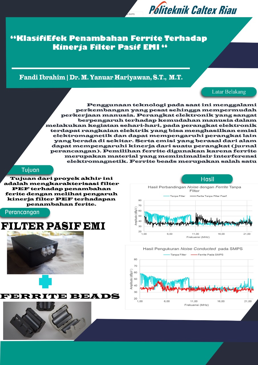 Penggunaan teknologi pada saat ini menggalami perkembangan yang pesat sehingga mempermudah perkerjaan manusia. Penelitian ini mengkarakterisasi filter pasif PEF dengan menambahkan ferrite pada rangkaian dimana akan dilihat pengaruh ferrite terhadap kinerja filter pasif. Filter pasif merupakan filter yang meredam interferensi elektormagnetik dengan menyaring sinyal pada frekuensi tertentu tanpa membutuhkan sumber listrik tambahan. Pemilihan ferrite digunakan karena ferrite merupakan material yang meminimalisir interferensi elektromagnetik. Penelitian ini menjelaskan pengaruh ferrite pada rangkaian PEF dalam meredam noise conducted. Besar noise pada frekuensi 1,7 Mhz tanpa filter PEF sebesar 57,72 dB saat diujikan hanya menggunakan ferrite meredam noise sebesar 36,69 dB sedangkan menggunakan filter pasif emi meredam noise menjadi 34,68 dB. Penambahan ferrite pada filter pasif emi yang dipasang pada posisi dekat dengan LISN meredam noise hingga 35,49 dB sedangkan posisi ferrite pada SMPS meredam noise hingga 38,29 dB, saat penambahan di kedua sisi SMPS dan LISN noise teredam menjadi 33,25 dB. Karakteristik dari penambahan ferrite dilihat dari pengaruh redaman yang terukur pada setiap kondisi pengujian yang dilakukan dan efektifitas pada setiap kondisi jika dilakukan. Pada pengujian frekuensi harmoni (THD) saat dipasangkan filter pasif menjadi 205,01% dari sebelumnya 809,5% pada saat filter pasif digunakan merupakan pengurangan terbaik diantara kondisi yang lain saat dilakukan pengujian.