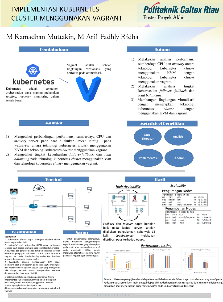 Perkembangan teknologi yang dapat mengemas sebuah aplikasi dan kebutuhannya dalam sebuah virtualisasi yang disebut container, oleh sebab itu dibutuhkan sebuah software yang dapat melakukan management terhadap container, salah satunya adalah docker. Namun kebutuhan selalu meningkat sistem tidak mampu untuk menampung banyak aplikasi, oleh karna itu dibutuhkan sebuah software yang mampu melakukan management clustering container dalam jumlah besar. Salah satu software tersebut adalah kubernetes. Setelah melakukan pengujian high-avaliability, scalability dan performance testing pada teknologi kubernetes cluster yang diterapkan pada virtualisasi vagrant dan KVM. Pengujian high-avaliability yang terdiri dari failover,failback dan loadbalancer dapat diimpementasikan pada kedua virtualisasi. Latency/delay pada virtualisasi vagrant lebih besar dari virtualisasi KVM dengan perbedaan latency/delay pada saat diakses 20 user sebesar 2,66 detik, 40 user sebesar 1,67 detik dan 60 user sebesar 6,03 detik. Kemudian Penggunaan sumber daya CPU dan Memory pada virtualisasi vagrant lebih besar. Adapun perbedaan persentase penggunaan CPU dan Memory pada virtualisasi vagrant dan KVM saat diakses 20 user yaitu CPU 9% dan Memory 5%, 40 user yaitu CPU 7% dan Memory 7%, 60 user yaitu CPU 9% dan Memory 10%.