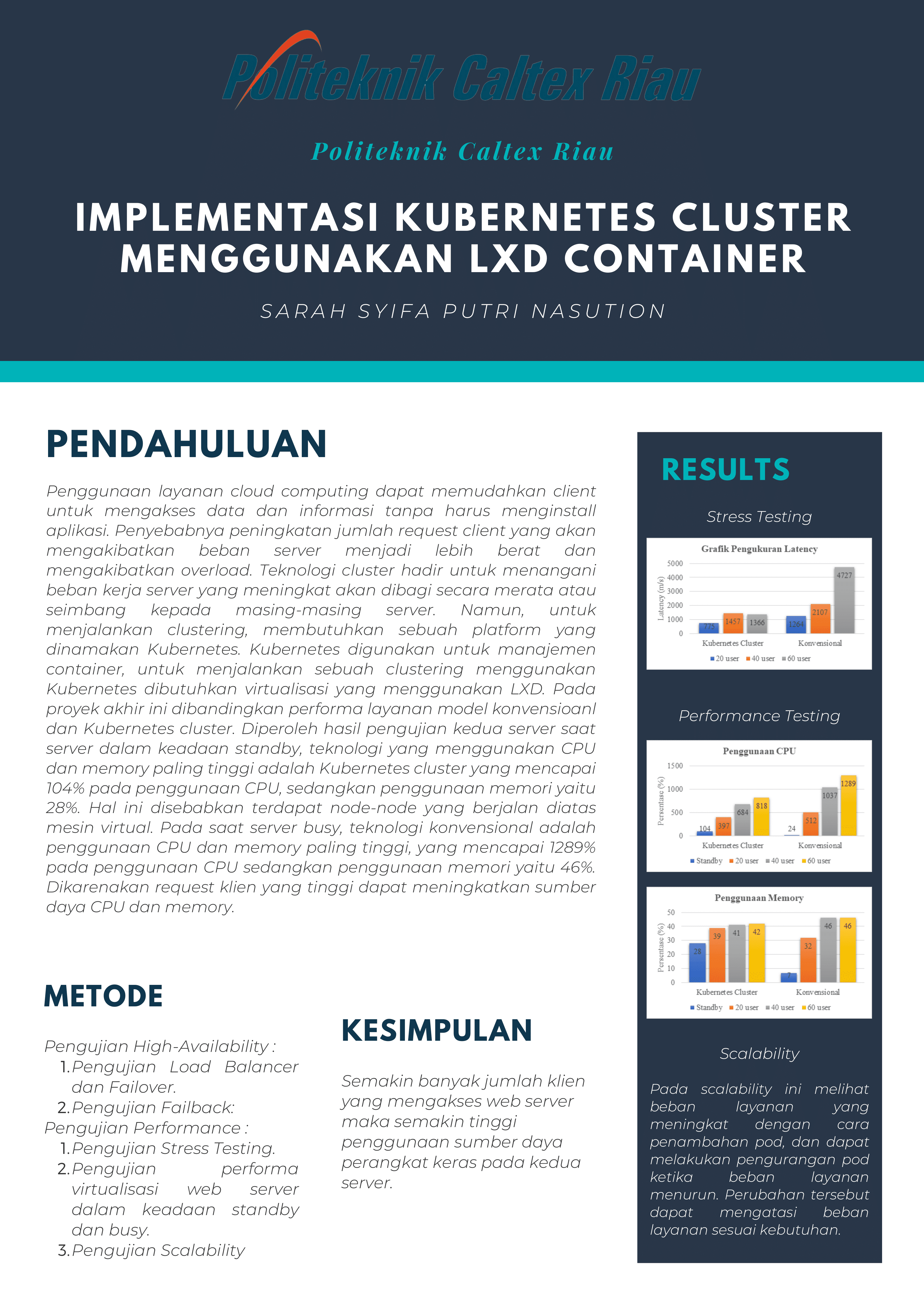 Penggunaan layanan cloud computing dapat memudahkan client untuk mengakses data dan informasi tanpa harus menginstall aplikasi. Penyebabnya peningkatan jumlah request client yang akan mengakibatkan beban server menjadi lebih berat dan mengakibatkan overload. Teknologi cluster hadir untuk menangani beban kerja server yang meningkat akan dibagi secara merata atau seimbang kepada masing-masing server. Namun, untuk menjalankan clustering, membutuhkan sebuah platform yang dinamakan Kubernetes. Kubernetes digunakan untuk manajemen container, untuk menjalankan sebuah clustering menggunakan Kubernetes dibutuhkan virtualisasi yang menggunakan LXD. Pada proyek akhir ini dibandingkan performa layanan model konvensioanl dan Kubernetes cluster. Diperoleh hasil pengujian kedua server saat server dalam keadaan standby, teknologi yang menggunakan CPU dan memory paling tinggi adalah Kubernetes cluster yang mencapai 104% pada penggunaan CPU, sedangkan penggunaan memori yaitu 28%. Hal ini disebabkan terdapat node-node yang berjalan diatas mesin virtual. Pada saat server busy, teknologi konvensional adalah penggunaan CPU dan memory paling tinggi, yang mencapai 1289% pada penggunaan CPU sedangkan penggunaan memori yaitu 46%. Dikarenakan request klien yang tinggi dapat meningkatkan sumber daya CPU dan memory.