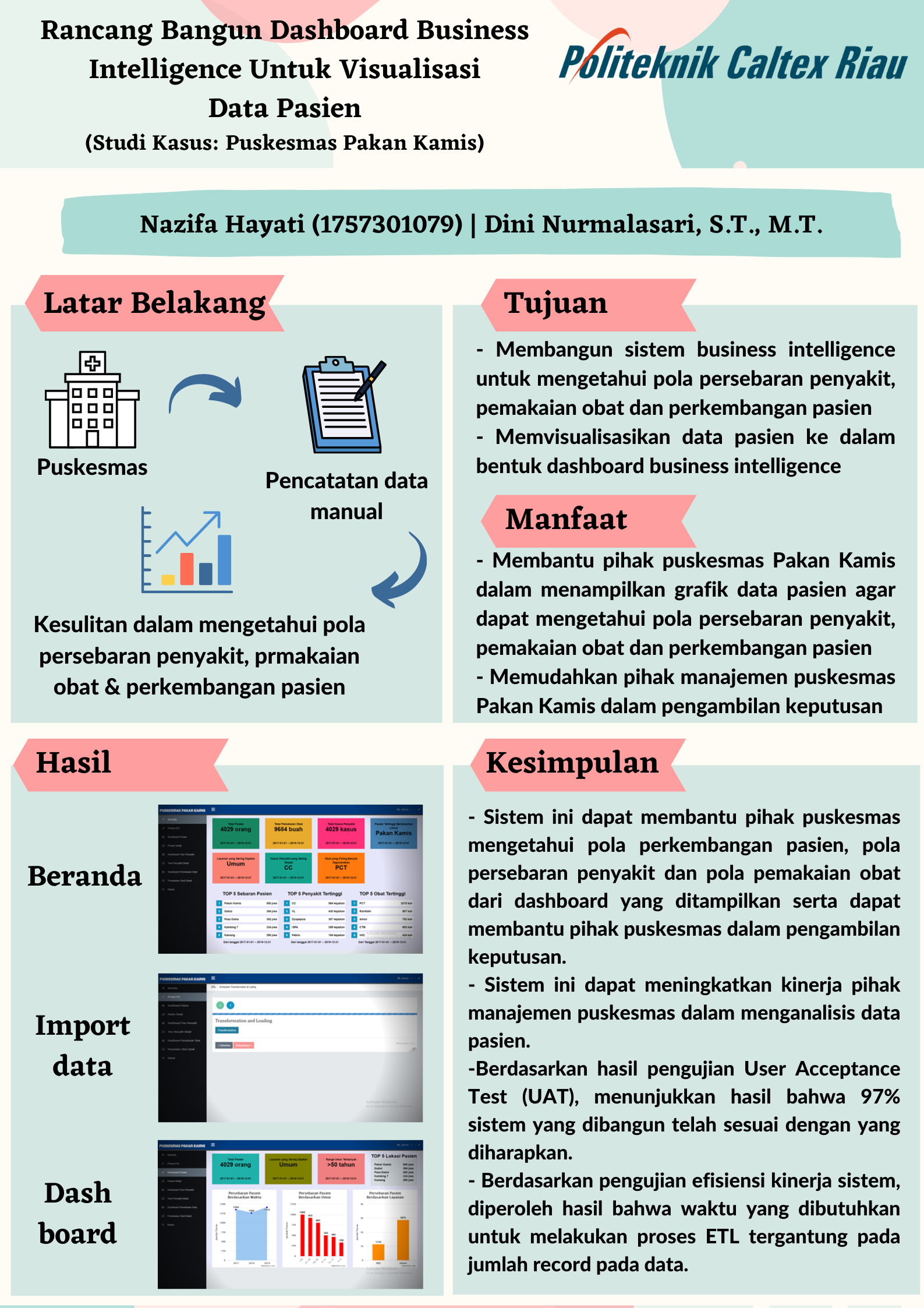 Pusat Kesehatan Masyarakat (Puskesmas) adalah unit pelaksana teknis dinas kabupaten/kota yang bertanggung jawab menyelenggarakan pembangunan kesehatan di suatau wilayah kerja. Salah satu pusat kesehatan masyarakat yang ada yaitu puskesmas Pakan Kamis. Berdasarkan interview yang dilakukan, pihak puskesmas masih mengalami kesulitan dalam mengetahui pola persebaran penyakit, pola pemakaian obat dan perkembangan pasien, karena proses perekapan dan perhitungan data yang masih dilakukan secara manual. Hal ini menyebabkan pihak manajemen puskesmas kesulitan dalam menganalisis data dan mendapatkan informasi untuk pengambilan keputusan. Oleh karena itu, dibuatlah dashboard business intelligence berbasis web yang dapat memvisualisasikan data pasien terkait permasalahan tersebut. Dashboard business intelligence ini dibangun menggunakan bahasa pemrograman PHP dan database MySQL. Dari hasil pengujian kepuasan pengguna didapat bahwa 97% sistem dashboard business intelligence untuk visualisasi data pasien ini sudah sesuai dengan kebutuhan dan dapat membantu pihak puskesmas dalam mengetahui pola persebaran penyakit, pemakaian obat dan perkembangan pasien, serta membantu pihak puskesmas dalam menganalisis data untuk pengambilan keputusan secara tepat dan efisien.