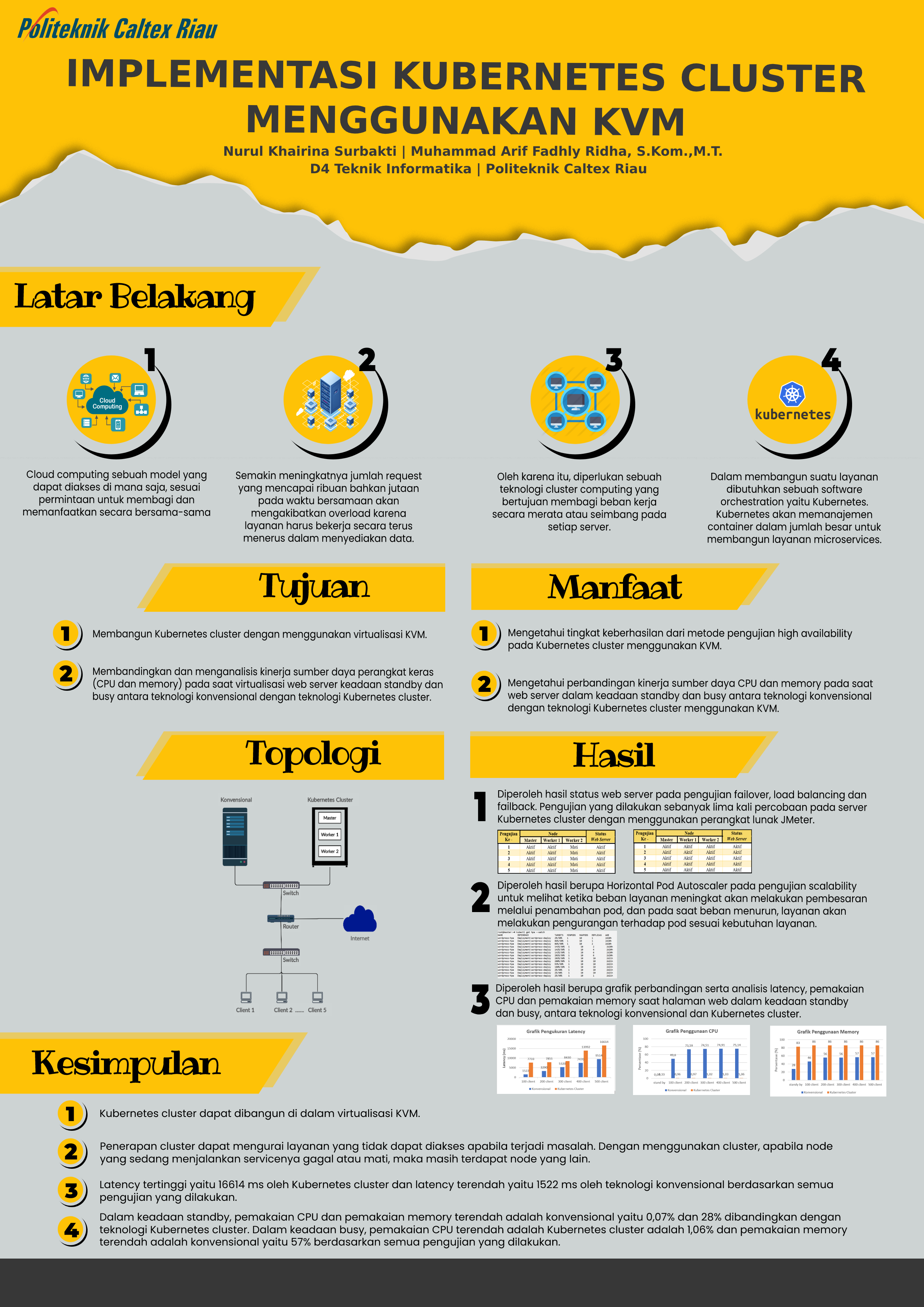 Perkembangan teknologi yang pesat menuntut layanan yang dapat diakses setiap saat. Semakin meningkatnya jumlah request client akan menyebabkan server mengalami down karena beban kerja yang lebih. Oleh karena itu, cluster hadir untuk menangani beban kerja server yang meningkat dan membagi secara merata setiap server. Namun, untuk menjalankan sebuah cluster, maka dibutuhkan sebuah software cluster orchestration yaitu Kubernetes. Kubernetes digunakan untuk manajemen container. Teknologi virtualisasi yang digunakan dalam Kubernetes adalah virtualisasi Kernel-Based Virtual Machine (KVM). Pada proyek akhir ini membandingkan latency, pemakaian CPU, dan pemakaian memori saat membuka halaman web, antara teknologi konvensional dan Kubernetes cluster. Diperoleh hasil pengujian latency tertinggi yaitu 16614 ms oleh Kubernetes cluster dan latency terendah yaitu 1522 ms oleh teknologi konvensional. Pada sistem konvensional, respons dari pengguna secara langsung diterima oleh web server, diolah lalu dikirim. Pada Kubernetes cluster terdapat node-node yang berjalan di atas mesin virtual, sehingga membutuhkan waktu yang lebih lama dalam memberikan respons. Latency yang baik yaitu latency rendah karena dapat membuka halaman web lebih cepat. Dalam keadaan standby, pemakaian CPU dan pemakaian memori terendah terjadi pada konvensional adalah 0,07% dan 28% karena tidak ada node-node yang berjalan di atas mesin virtual. Dalam keadaan busy, pemakaian CPU terendah terjadi pada server Kubernetes cluster adalah 1,06% karena adanya pembagian beban kerja terhadap mesin virtual. Pemakaian memory terendah terjadi pada server konvensional adalah 57% karena tidak ada node-node yang berjalan di atas mesin virtual.