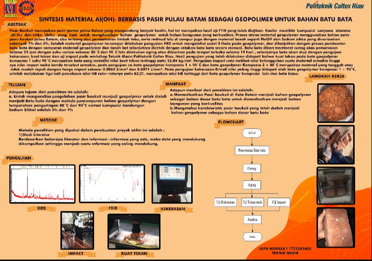 Pasir Bauksit merupakan pasir pantai pulau Batam yang mengandung banyak kaolin, hal ini merupakan hasil uji FTIR yang telah diujikan. Kaolin memiliki komposisi senyawa alumina (Al₂O₃) dan silika (SiO₂) yang baik untuk menghasilkan bahan geopolymer untuk bahan bangunan yang berkualitas. Proses sitesis material geopolymer menggunakan bahan yaitu pasir bauksit pulau Batam, abu terbang dari pembakaran limbah tebu, serta redmud lalu di campur juga dengan material basah separti NaOH dan Sodium silika yang divariasikan sebanyak 7% dan 5%. Setelah material geopolymer tercampur dilakukan pengujian XRD untuk mengetahui sudut 2 theta pada geopolymer, dan dilanjutkan dengan proses pembuatan batu bata dengan campuran material geopolymer dan tanah liat selanjutnya dicetak dengan cetakan batu bata secara manual. Batu bata diberi treatment curing atau pemanasan selama 24 jam dengan suhu variasi sebesar 80°C dan 90°C lalu dilakukan aging atau dibiarkan pada tempat terbuka selama 14 hari , selanjutnya bata akan diuji dengan pengujian kekerasan, kuat tekan dan uji impact pada workshop Teknik Mesin Politeknik Caltex Riau. Hasil pengujian yang telah dilakukan didapati bahwa kuat tekan pada bata geopolymer komposisi 1 suhu 90°C merupakan bata yang memiliki nilai kuat tekan tertinggi.