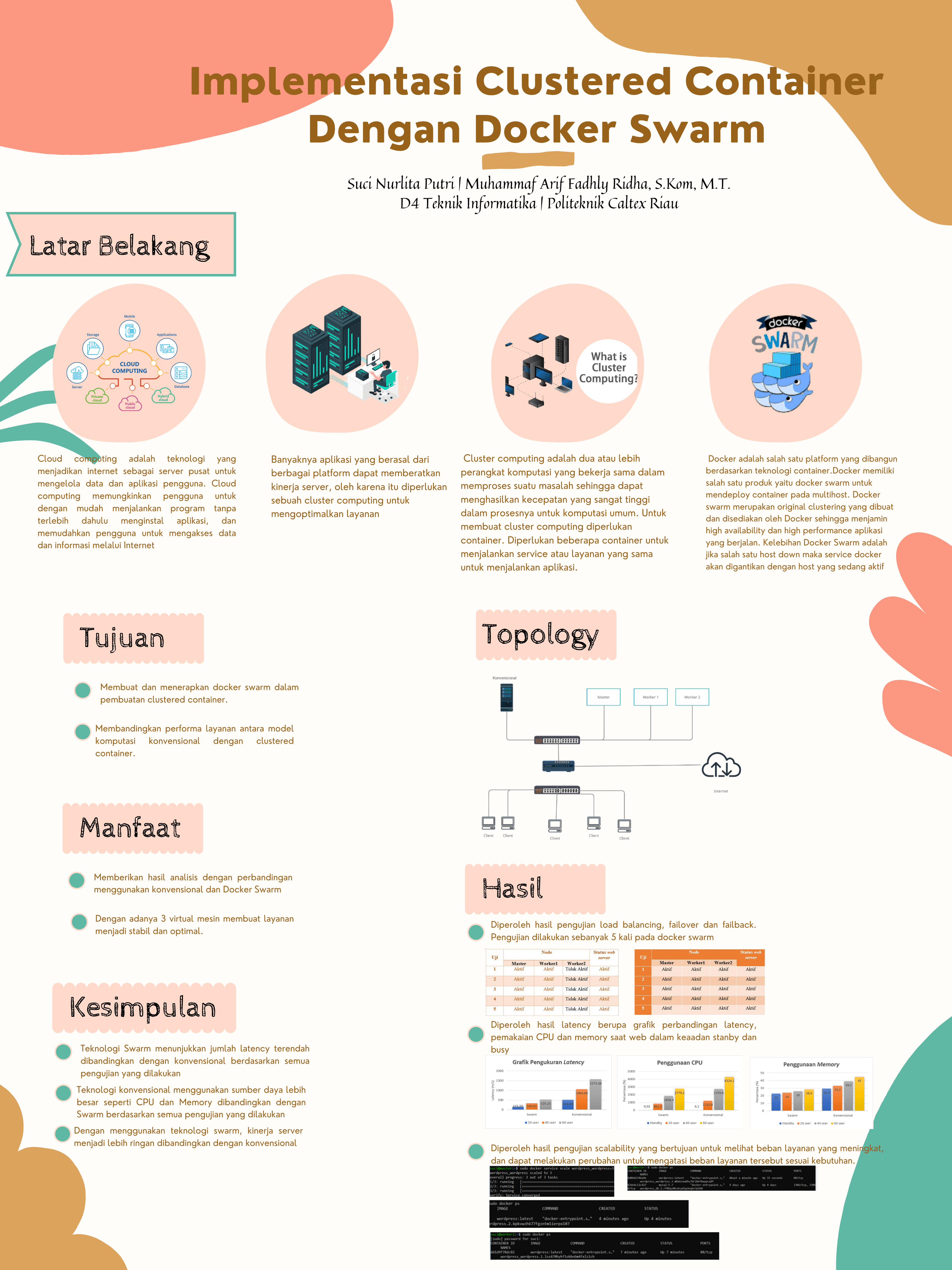 Perkembangan teknologi yang pesat dapat mendorong pekerjaan di segala bidang. Teknologi diciptakan berdasarkan kebutuhan dan sumber daya yang terus meningkat. Namun permasalahan yang sering terjadi adalah trafik yang tinggi menyebabkan server down karena server masih menggunakan komputasi konvensional, sehingga beban kerja server menjadi berat dan overload. Dengan menggunakan teknologi komputasi cluster, proses yang masuk dapat didistribusikan secara merata di antara setiap perangkat atau node perangkat keras. Seiring kemajuan teknologi, cluster dapat digabungkan dengan container. Salah satu platform pengelola teknologi container adalah docker. Docker memiliki salah satu produknya yaitu docker swarm, yang dapat menerapkan container pada banyak host. Pada saat server dalam keadaan standby, teknologi konvensional menggunakan CPU dan memory yang paling tinggi. Dimana penggunaan CPU sebesar 6.2 ms dan penggunaan memory sebesar 29.4%. Dan ketika saat server dalam keadaan busy, teknologi konvensional menggunaan CPU dan memory dalam jumlah yang tinggi. Pada penggunaan CPU sebesar 4324.1 m/s dan penggunaan memory sebesar 45%. Sehingga didapatkan hasil pengujian bahwa teknologi swarm dapat meringankan beban kinerja sever dibandingkan dengan konvensional.