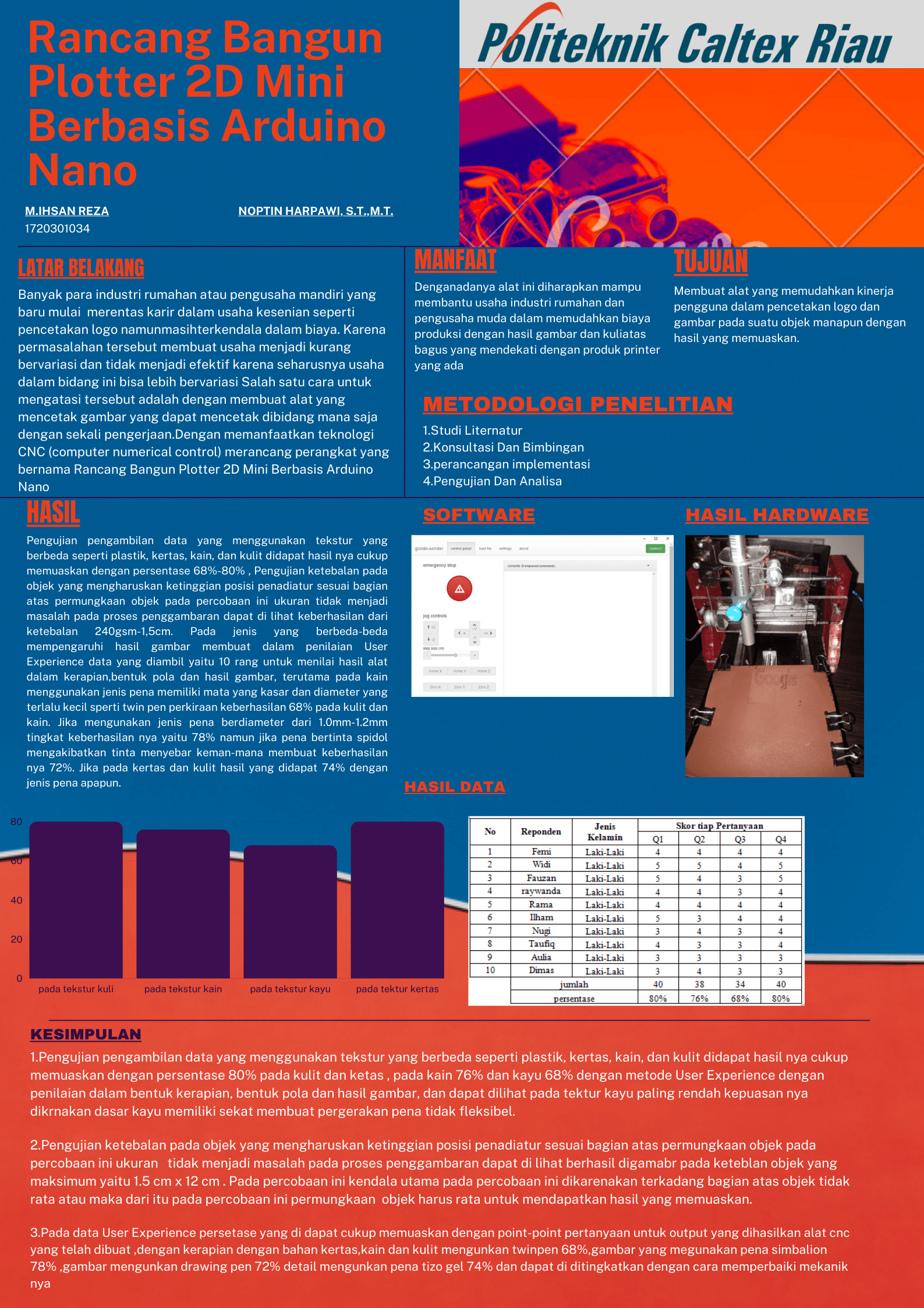 CNC (Computer Numerical Control) adalah sistem otomasi mesin perkakas yang dioperasikan melalui perintah yang diprogram secara abstrak dan juga mesin kontrol yang digerakan oleh komputer yang menghasilkan kepresisian yang sangat tinggi. Pengujian pengambilan data yang menggunakan tekstur yang berbeda seperti plastik, kertas, kain, dan kulit didapat hasil nya cukup memuaskan dengan persentase 68%-80% , Pengujian ketebalan pada objek yang mengharuskan ketinggian posisi pena diatur sesuai bagian atas permungkaan objek pada percobaan ini ukuran tidak menjadi masalah pada proses penggambaran dapat di lihat keberhasilan dari ketebalan 240gsm-1,5cm. Pada jenis yang berbeda-beda mempengaruhi hasil gambar membuat dalam penilaian User Experience data yang diambil yaitu 10 orang untuk menilai hasil alat dalam kerapian,bentuk pola dan hasil gambar, terutama pada kain menggunakan jenis pena memiliki mata yang kasar dan diameter yang terlalu kecil sperti twin pen perkiraan keberhasilan 68% pada kulit dan kain. Jika mengunakan jenis pena berdiameter dari 1.0mm-1.2mm tingkat keberhasilan nya yaitu 78% namun jika pena bertinta spidol mengakibatkan tinta menyebar keman-mana membuat keberhasilan nya 72%. Jika pada kertas dan kulit hasil yang didapat 74% dengan jenis pena apapun.