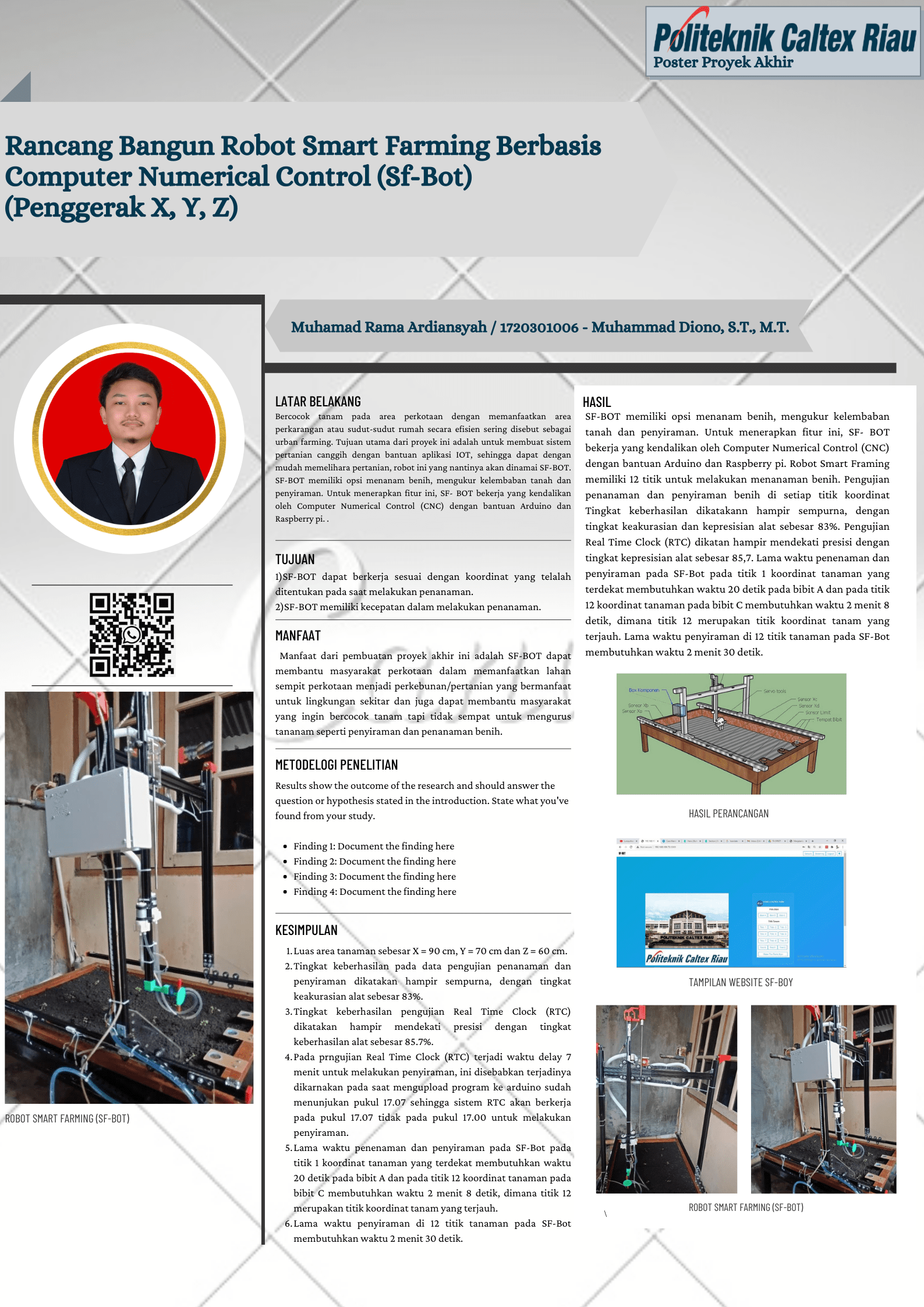 Bercocok tanam pada area perkotaan dengan memanfaatkan area perkarangan atau sudut-sudut rumah secara efisien sering disebut sebagai urban farming. Tujuan utama dari proyek ini adalah untuk membuat sistem pertanian canggih dengan bantuan aplikasi IOT, sehingga dapat dengan mudah memelihara pertanian, robot ini yang nantinya akan dinamai SF-BOT. SF-BOT memiliki opsi menanam benih, mengukur kelembaban tanah dan penyiraman. Untuk menerapkan fitur ini, SF- BOT bekerja yang kendalikan oleh Computer Numerical Control (CNC) dengan bantuan Arduino dan Raspberry pi. Pengujian penanaman dan penyiraman benih di setiap titik koordinat Tingkat keberhasilan dikatakann hampir sempurna, dengan tingkat keakurasian dan kepresisian alat sebesar 83%. Pengujian Real Time Clock (RTC) dikatan hampir mendekati presisi dengan tingkat kepresisian alat sebesar 85,7. Lama waktu penenaman dan penyiraman pada SF-Bot pada titik 1 koordinat tanaman yang terdekat membutuhkan waktu 20 detik pada bibit A dan pada titik 12 koordinat tanaman pada bibit C membutuhkan waktu 2 menit 8 detik, dimana titik 12 merupakan titik koordinat tanam yang terjauh. Lama waktu penyiraman di 12 titik tanaman pada SF-Bot membutuhkan waktu 2 menit 30 detik.
