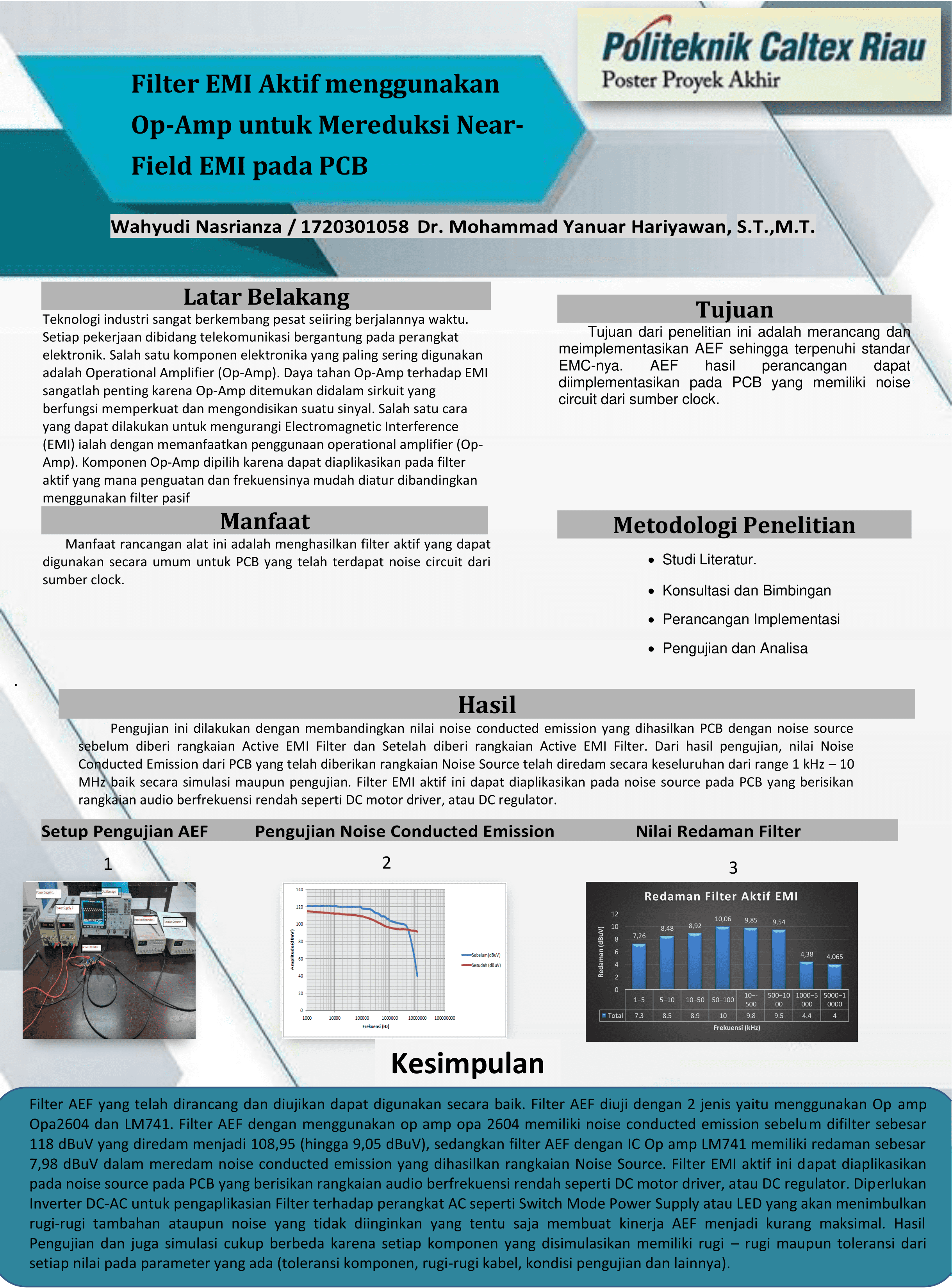 Perangkat elektronik sering menimbulkan peningkatan Electromagnetic Interference (EMI) yang memiliki dua jenis yaitu Conducted Emission dan Radiated Emmision. Salah satu solusi untuk mengurangi mitigasi EMI itu adalah menggunakan filter EMI. Operational Amplifiers (Op Amps) merupakan salah satu bentuk IC Linear yang memiliki fungsi untuk menguatkan sinyal listrik. Dalam proyek akhir ini akan dibahas penggunaan op-amp untuk meminimalisir near-field EMI. Dalam hal ini dilakukan penambahan rangkaian op-amp untuk mereduksi EMI dari sumber clock. Salah satu karakter terpenting dari op-amp adalah impedansi outputnya yang sangan rendah. Penelitian ini akan melakukan perancangan filter EMI aktif untuk meredam noise conducted emission menggunakan sebuah Active EMI Filter (AEF). Filter AEF yang telah dirancang dan menghasilkan redaman noise conducted emission yang sangat baik dengan noise conducted emission sebelum difilter sebesar 118 dB yang diredam menjadi 108,95 dB dan menghasilkan redaman noise conducted emission yang sangat baik (hingga 9,05 dB).
