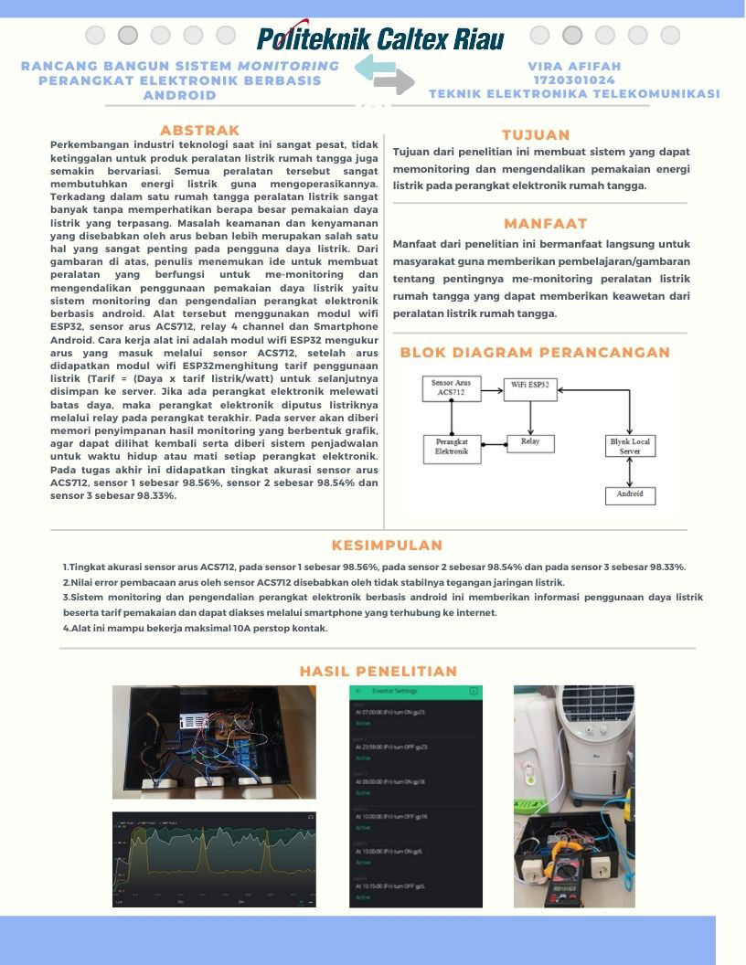 Perkembangan industri teknologi disaat ini sangat pesat, tidak ketinggalan untuk produk peralatan listrik rumah tangga juga semakin bervariasi. Seluruh peralatan tersebut sangat memerlukan energi listrik guna mengoperasikannya. Terkadang dalam satu rumah tangga peralatan listrik sangat banyak tanpa memperhatikan berapa besar pemakaian daya listrik yang terpasang. Masalah kemanan dan kenyamanan yang disebabkan oleh arus beban lebih adalah salah satu hal yang sangat penting pada pengguna daya listrik. Dari gambaran di atas, penulis menemukan ide untuk membuat peralatan yang berfungsi untuk me-monitoring serta mengendalikan penggunaan pemakaian daya listrik yaitu sistem monitoring dan pengendalian perangkat elektronik berbasis Android. Alat tersebut menggunakan modul wifi ESP32, sensor arus ACS712, relay 4 channel dan Smarthphone Android. Cara kerja alat ini adalah modul wifi ESP32 mengukur arus yang masuk melalui sensor ACS712, setelah arus didapatkan modul wifi ESP32 menghitung tarif penggunaan listrik (Tarif= Daya x tarif listrik/watt) untuk selanjutnya disimpan ke server. Jika terdapat perangkat elektronik melewati batas daya, maka perangkat elektronik diputus listriknya melalui relay pada perangkat terakhir. Pada server akan diberi memori penyimpanan hasil monitoring yang berbentuk grafik, agar dapat dilihat kembali serta diberi sistem penjadwalan untuk waktu hidup atau mati setiap perangkat elektronik. Pada tugas akhir ini didapatkan tingkat akurasi sensor arus ACS712, sensor 1 sebesar 98.56%, sensor 2 sebesar 98.54% dan sensor 3 sebesar 98.33%