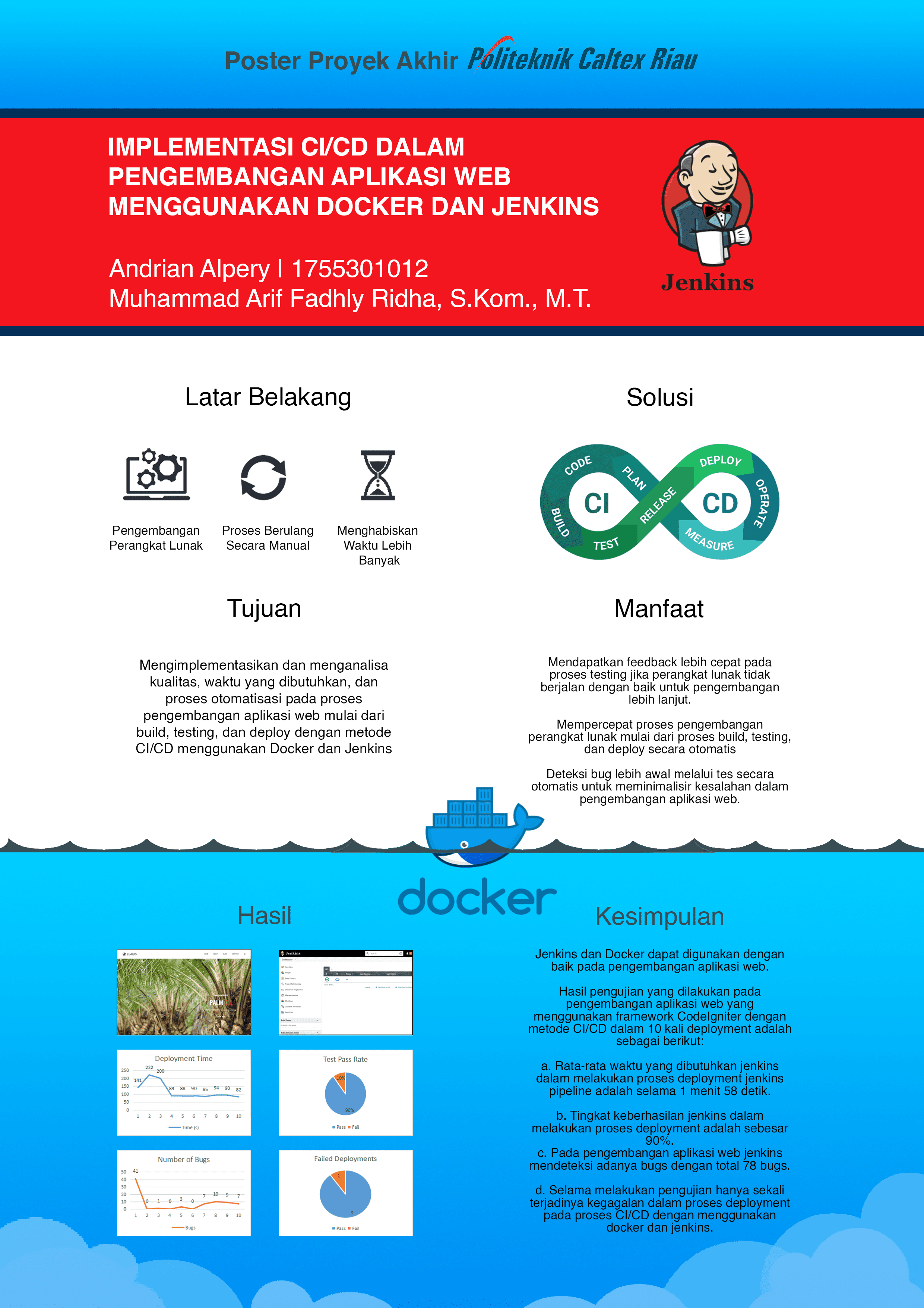 Dalam proses pengembangan perangkat lunak saat ini yaitu proses build, testing, dan deployment pada umumnya dilakukan secara konvensional. Proses build dan testing perangkat lunak dilakukan secara terpisah oleh tim pengembang dan pengujian. Setelah proses build dan testing selesai, kemudian perangkat lunak diserahkan kepada tim operasional untuk melakukan deployment. Hal ini memerlukan waktu lebih lama karena proses tersebut dilakukan dengan cara berulang kali secara manual. CI/CD adalah konsep yang diimplementasikan sebagai sebuah proses yang dapat membantu pengembang aplikasi untuk menggabungkan kode yang baru dengan kode utama, kemudian memudahkan untuk melakukan serangkaian test pada setiap stage yang ada, dan diakhiri dengan proses deployment. Tujuan dari penelitian ini adalah mengimplementasikan dan menganalisa kualitas, waktu yang dibutuhkan, dan proses otomatisasi pada proses pengembangan aplikasi web mulai dari build, testing, dan deploy dengan metode CI/CD menggunakan Docker dan Jenkins. Berdasarkan hasil pengujian yang dilakukan pada pengembangan aplikasi web yang menggunakan framework CodeIgniter dalam 10 kali deployment adalah sebagai berikut: rata-rata waktu yang dibutuhkan jenkins dalam melakukan proses deployment jenkins pipeline adalah selama 1 menit 58 detik, dengan tingkat keberhasilan sebesar 90%, 78 bugs, dan selama melakukan pengujian hanya sekali terjadinya kegagalan dalam proses deployment.