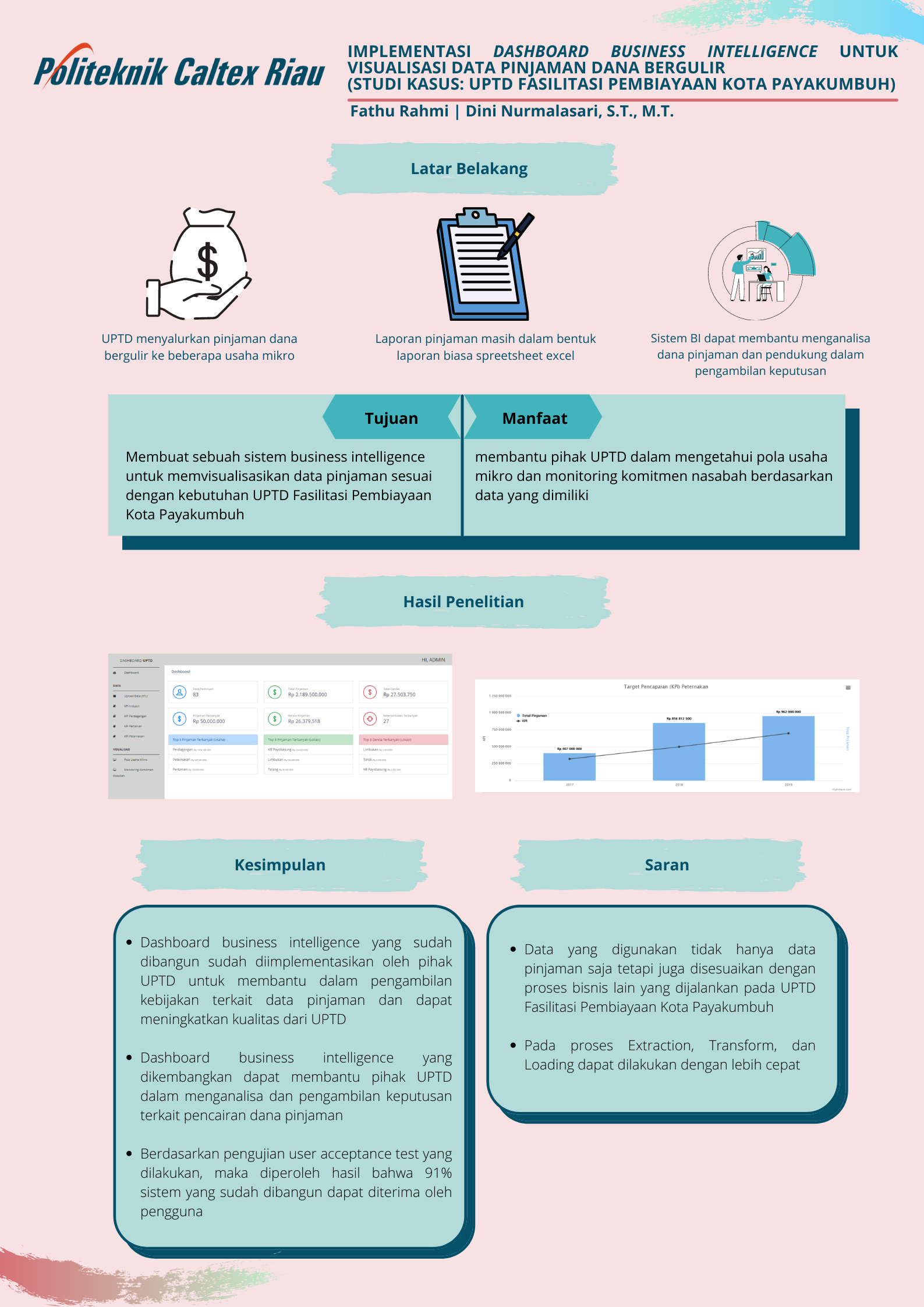 UPTD Fasilitasi Pembiayaan Kota Payakumbuh merupakan suatu Lembaga Keuangan Mikro yang memberikan dan mengelola bantuan berupa pinjaman dana bergulir untuk memperkuat modal usaha bagi pelaku usaha mikro seperti peternakan, perdagangan, pertanian dan industri. Berdasarkan informasi yang diperoleh melalui wawancara dengan pihak UPTD, bahwasanya terdapat kesulitan dalam memperoleh informasi terkait usaha mikro dan monitoring komitmen nasabah. Dimana data yang dimiliki saat ini masih dikelola secara konvensional sehingga pihak UPTD sulit dalam memperoleh informasi. Oleh karena itu itu, dibuatlah sistem Dashboard Business Intelligence yang dapat membantu pihak UPTD dalam pengelolaan data dan memberikan informasi terkait usaha mikro untuk memaksimalkan dana pinjaman agar pinjaman yang diberikan bisa membantu dalam peningkatan perekonomian masyarakat. Sistem ini dibangun dengan menggunakan Framework Codeigniter, bahasa pemrograman PHP dan MySQL sebagai DBMS nya. Sistem ini diuji menggunakan pengujian blackbox testing dan pengujian user acceptance test (UAT). Berdasarkan pengujian blackbox testing yang telah dilakukan bahwa fungsionalitas sistem sudah sesuai dengan harapan pengguna. Sedangkan berdasarkan pengujian user acceptance test (UAT) yang telah dilakukan menunjukkan bahwa 91% sistem yang telah dibangun sudah dapat diterima oleh pengguna dan dapat membantu pihak UPTD dalam melakukan pengambilan keputusan.