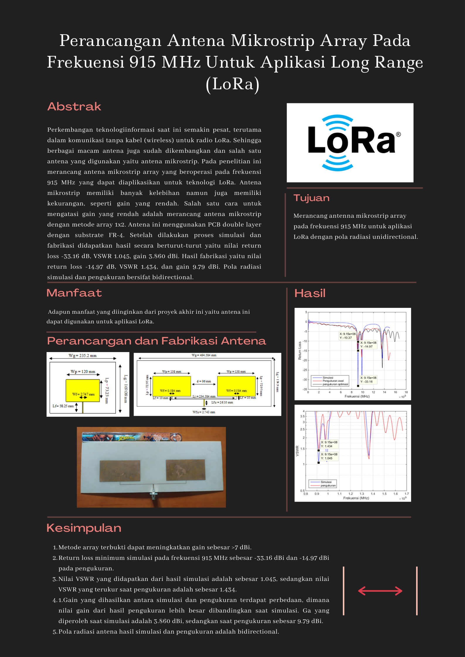 Perkembangan teknologi informasi saat ini semakin pesat, terutama dalam komunikasi tanpa kabel (wireless) untuk radio LoRa. Sehingga berbagai macam antena juga sudah dikembangkan dan salah satu antena yang digunakan yaitu antena mikrostrip. Pada penelitian ini merancang antena mikrostrip array yang beroperasi pada frekuensi 915 MHz yang dapat diaplikasikan untuk teknologi LoRa. Antena mikrostrip memiliki banyak kelebihan namun juga memiliki kekurangan, seperti gain yang rendah. Salah satu cara untuk mengatasi gain yang rendah adalah merancang antena mikrostrip dengan metode array 1x2. Antena ini menggunakan PCB double layer dengan substrate FR-4. Setelah dilakukan proses simulasi dan fabrikasi didapatkan hasil secara berturut-turut yaitu nilai return loss -33.16 dB, VSWR 1.045, gain 3.860 dBi. Hasil fabrikasi yaitu nilai return loss -14.97 dB, VSWR 1.434, dan gain 9.79 dBi. Pola radiasi simulasi dan pengukuran bersifat bidirectional.