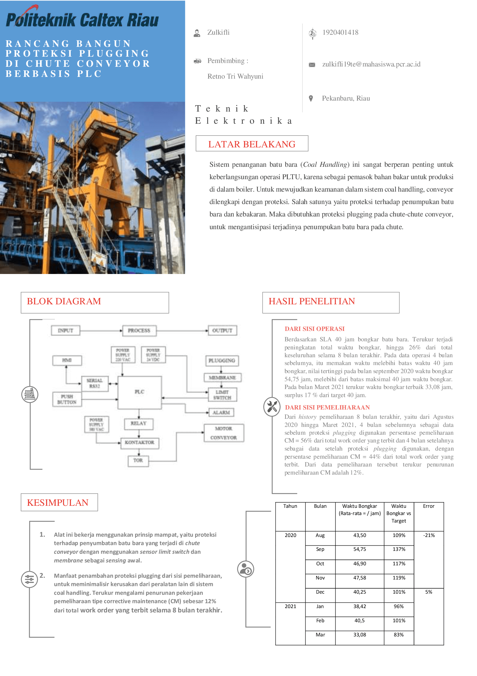 Sistem coal handing memegang peranan sebagai sistem yang mensuplai batu bara untuk PLTU Tenayan, dengan SLA (Service Level Agreement) 40 jam waktu bongkar tiap shipment. Permasalahan yang sering terjadi pada saat pembongkaran batu bara adalah tumpahnya batu bara di jalur bongkar, karena penumpukan dan batu bara dengan dimensi besar mengganggu performa peralatan lain. Untuk meningkatkan keamanan dan efisiensi operasi, dalam sistem coal handling akan dilengkapi dengan sistem proteksi plugging, yang dipasang di chute conveyor. Sistem ini bekerja berdasarkan prinsip kemampatan dimensi, dengan menggunakan feedback dari sensor limit switch yang mengirimkan sinyal ke PLC sebagai controller. Yang kemudian akan menonaktifkan motor conveyor. Sebelum proteksi ini digunakan waktu bongkar defisit -21% dari target maksimal 40 jam, dan setelah proteksi ini digunakan rata-rata waktu bongkar 4 bulan terakhir adalah 95%, surplus 5% dari waktu 40 jam. Dari data pemeliharaan terukur sebelum proteksi plugging digunakan, persentase pemeliharaan CM = 56% dan setelah proteksi plugging digunakan persentase pemeliharaan CM = 44%, terukur penurunan pemeliharaan CM adalah 12%.