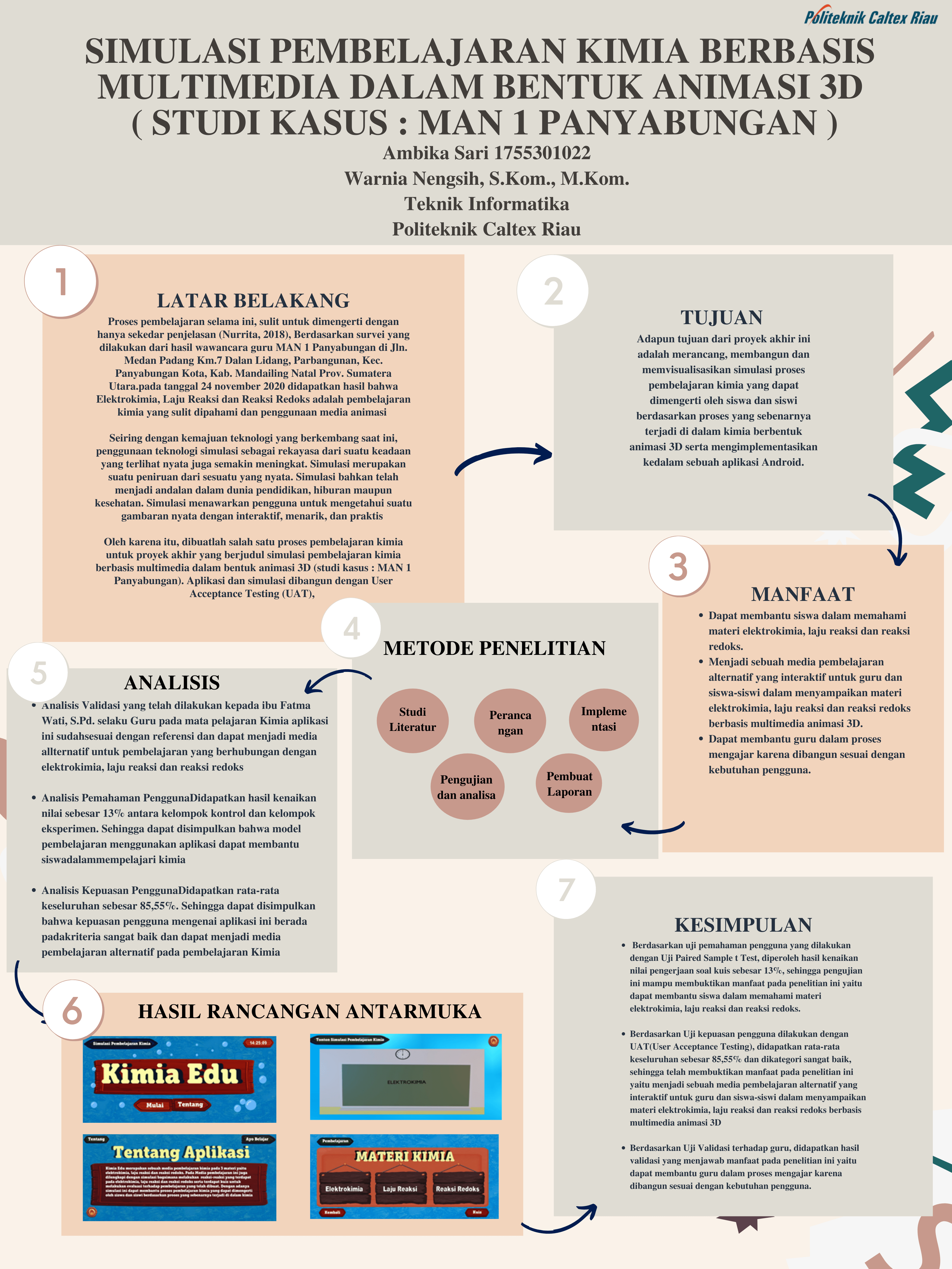 Ilmu kimia adalah mempelajari bangun struktur materi dan perubahan-perubahan yang dialami materi dalam proses alamiah maupun dalam eksperimen. pada mata pelajaran kimia pada Elektrokimia, Laju Reaksi dan Reaksi redoks diklasifikasikan sebagai mata pelajaran yang cukup sulit bagi sebagian siswa SMA/MA dan peralatannya untuk peraktek tidak cukup. Oleh karena itu dibangun sebuah pembelajaran berupa simulasi berbasis multimedia dalam bentuk Animasi 3D yang dimuat dalam bentuk aplikasi berbasis android yang dilengkap dengan animasi dan objek-objek pendukung, terdapat simulasi untuk melakukan reaksi serta terdapat kuis. Informasi yang diberikan pada video simulasi sudah sesuai referensi yang telah divalidasi oleh guru MAN 1 Panyabungan kompetensi pada bidang Kimia. pada pengujian Paired Sample t-Test terdapat kenaikan nilai kuis saat menggunakan aplikasi daripada menggunakan buku dalam memahami materi Kimia pada eletrokimia, laju reaksi dan reaksi redoks sebesar 13%. Dan survei tingkat kepuasan terhadap aplikasi yang dilakukan pada 30 orang siswa dan diperoleh hasil rata-rata keseluruhan sebesar 85,55%. Sehingga berdasarkan penelitian yang dilakukan secara keseluruhan aplikasi dapat dijadikan sebagai media alternatif yang interaktif dalam mempelajari proses pembelajaran kimia berdasarkan proses yang sebenarnya terjadi pada elektrokimia, laju reaksi dan reaksi redoks dalam bentuk animasi 3D.