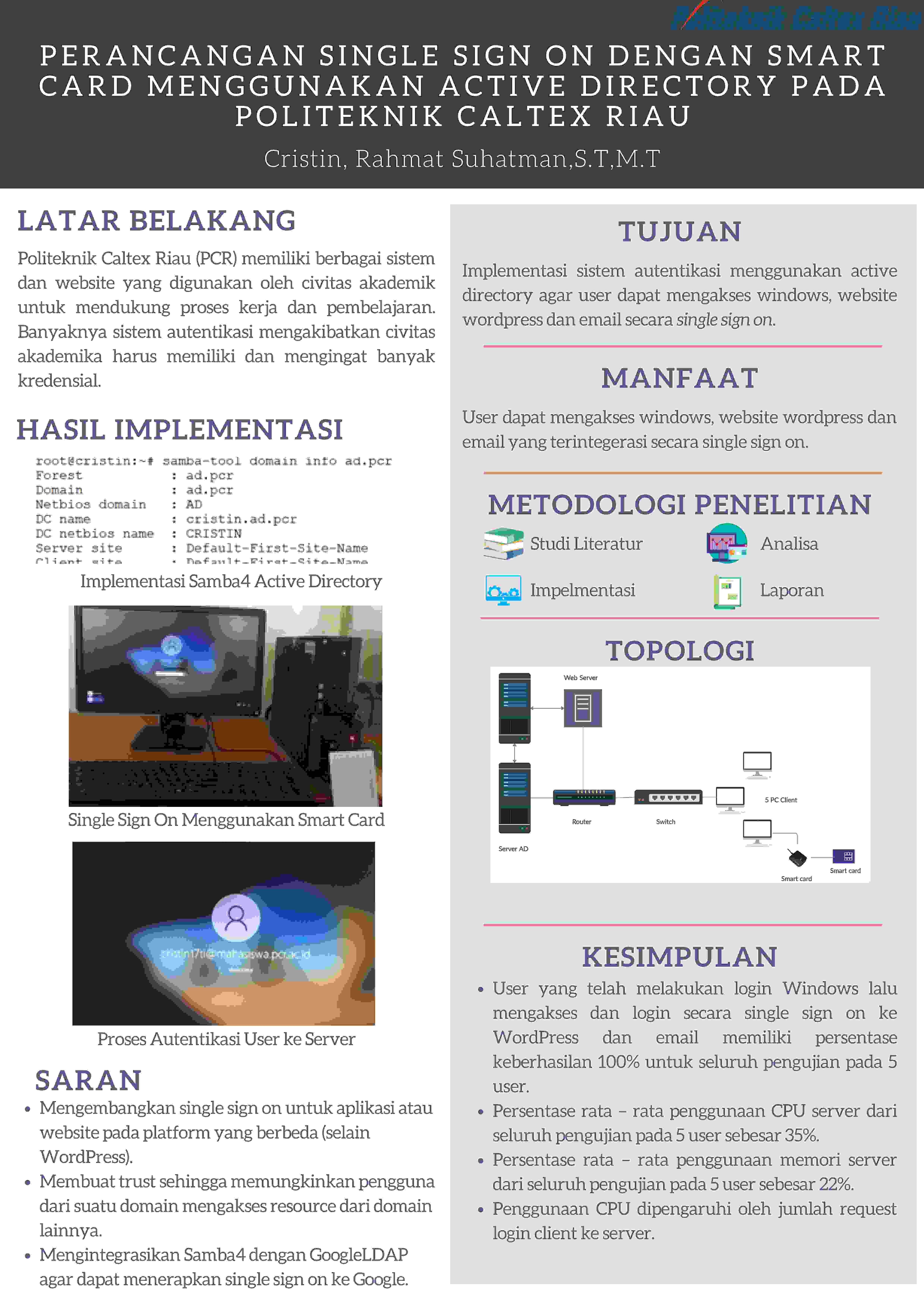 Penggunaan teknologi informasi sudah menjadi keharusan untuk menunjang kelancaran proses kerja dan pembelajaran salah satunya di Politeknik Caltex Riau (PCR). PCR memiliki berbagai sistem dan website yang dapat digunakan oleh pengguna. Pada umumnya, sistem dan website tersebut dikembangkan oleh pengembang yang berbeda-beda dan memiliki sistem autentikasi login sendiri. Single sign on merupakan sebuah sistem autentikasi terhadap user yang hanya dengan sekali login user dapat mengakses beberapa website tanpa harus login kembali website lainnya. Smart card digunakan sebagai alat kemudahan login bagi pengguna. Pada penelitian ini melakukan perancangan dan implementasi autentikasi single sign on dengan smart card menggunakan Samba4 Active Directory. Berdasarkan hasil pengujian fungsionalitas didapatkan rata-rata keberhasilan user melakukan login Windows, WordPress dan email secara single sign on menggunakan smart card sebesar 100%. Berdasarkan hasil pengujian kinerja yang telah dilakukan rata-rata penggunaan CPU server sebesar 35% dan penggunaan memori server sebesar 22% pada pengujian 5 user. Request login client dan proses autentikasi user mempengaruhi penggunaan CPU. Sedangkan persentase penggunaan memori stabil karena tidak ada aktifitas user yang membebankan memori.