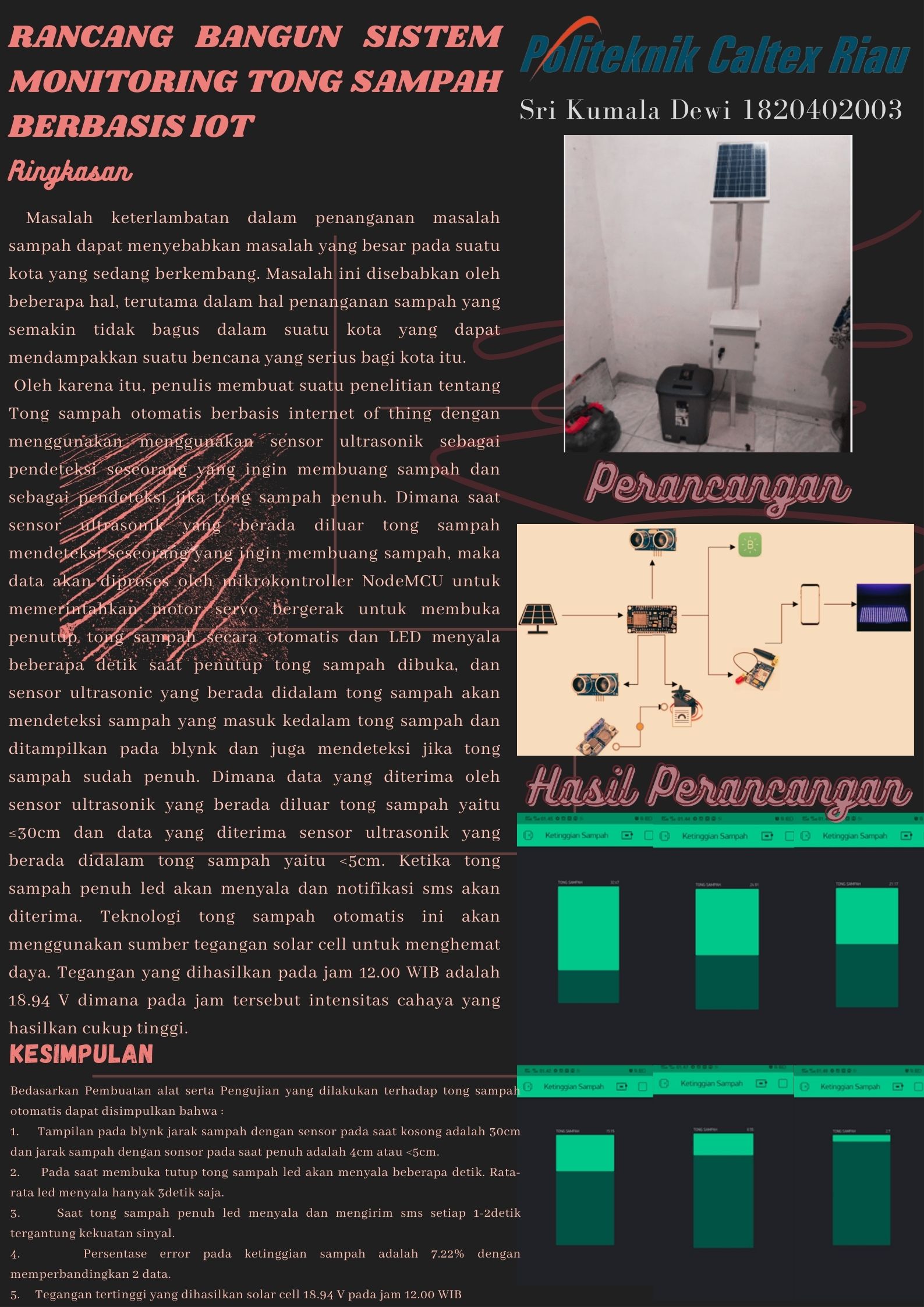 Oleh karena itu, penulis membuat suatu penelitian tentang Tong sampah otomatis berbasis internet of thing dengan menggunakan menggunakan sensor ultrasonik sebagai pendeteksi seseorang yang ingin membuang sampah dan sebagai pendeteksi jika tong sampah penuh. Dimana saat sensor ultrasonik yang berada diluar tong sampah mendeteksi seseorang yang ingin membuang sampah, maka data akan diproses oleh mikrokontroller NodeMCU untuk memerintahkan motor servo bergerak untuk membuka penutup tong sampah secara otomatis dan LED menyala beberapa detik saat penutup tong sampah dibuka, dan sensor ultrasonic yang berada didalam tong sampah akan mendeteksi sampah yang masuk kedalam tong sampah dan ditampilkan pada blynk dan juga mendeteksi jika tong sampah sudah penuh. Dimana data yang diterima oleh sensor ultrasonik yang berada diluar tong sampah yaitu ≤30cm dan data yang diterima sensor ultrasonik yang berada didalam tong sampah yaitu