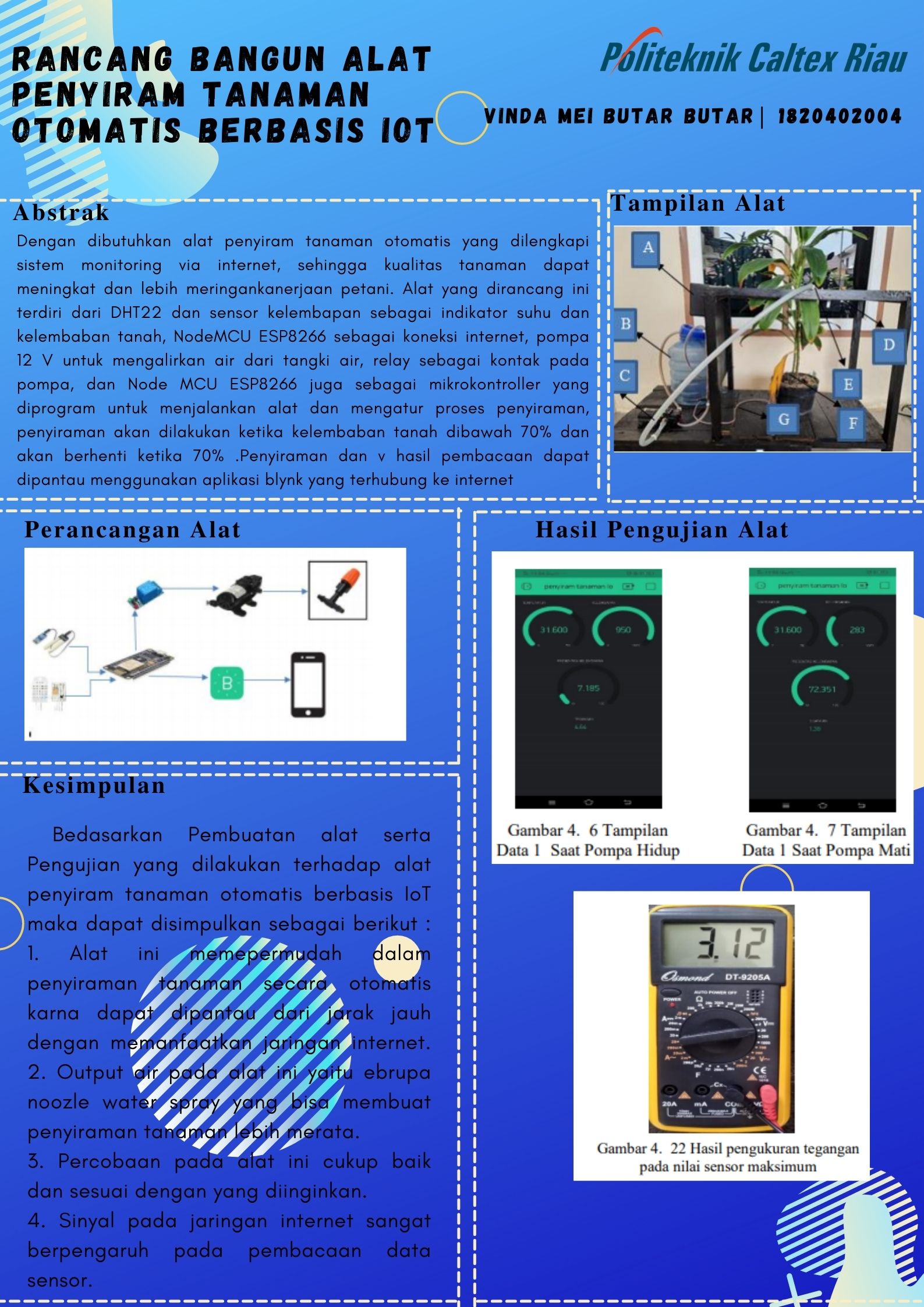 Di era sekarang ini, penggunaan Internet of Things (IoT) sudah banyak digunakan di berbagai bidang. Hampir semua perangkat elektronik terhubung ke internet. Dengan berkembangnya ilmu pengetahuan dan teknologi, maka penerapan ilmu pengetahuan dan teknologi di bidang pertanian menjadi sangat penting. karena meningkatnya permintaan untuk pemantauan dan perawatan tanaman. Oleh karena itu, pentingnya perawatan serta pemantauan pada tanaman agar dapat menghasilkan kualitas yang baik. Tanaman akan berkualitas baik jika dirawat dengan baik serta penyiramannya juga harus teratur, karena jika tidak teratur dalam menyiram tanaman maka daunnya akan layu dan pertumbuhannya akan lambat atau bisa saja tanaman tersebut akan mati. Penyiraman biasanya dilakukan secara manual. Cara ini kurang efektif karena jumlah air tidak sesuai dengan kebutuhan, lebih banyak memakan tenaga dan waktu. Maka dari itu dibutuhkan alat penyiram tanaman otomatis yang dilengkapi sistem monitoring via internet, sehingga kualitas tanaman dapat meningkat dan lebih meringankan pekerjaan petani. Alat yang dirancang ini terdiri dari DHT22 dan sensor kelembapan sebagai indikator suhu dan kelembaban tanah, NodeMCU ESP8266 sebagai koneksi internet, pompa 12 V untuk mengalirkan air dari tangki air, relay sebagai kontak pada pompa, dan Node MCU ESP8266 juga sebagai mikrokontroller yang diprogram untuk menjalankan alat dan mengatur proses penyiraman, penyiraman akan dilakukan ketika kelembaban tanah dibawah 70% dan akan berhenti ketika 70% .Penyiraman dan hasil pembacaan dapat dipantau menggunakan aplikasi blynk yang terhubung ke internet.