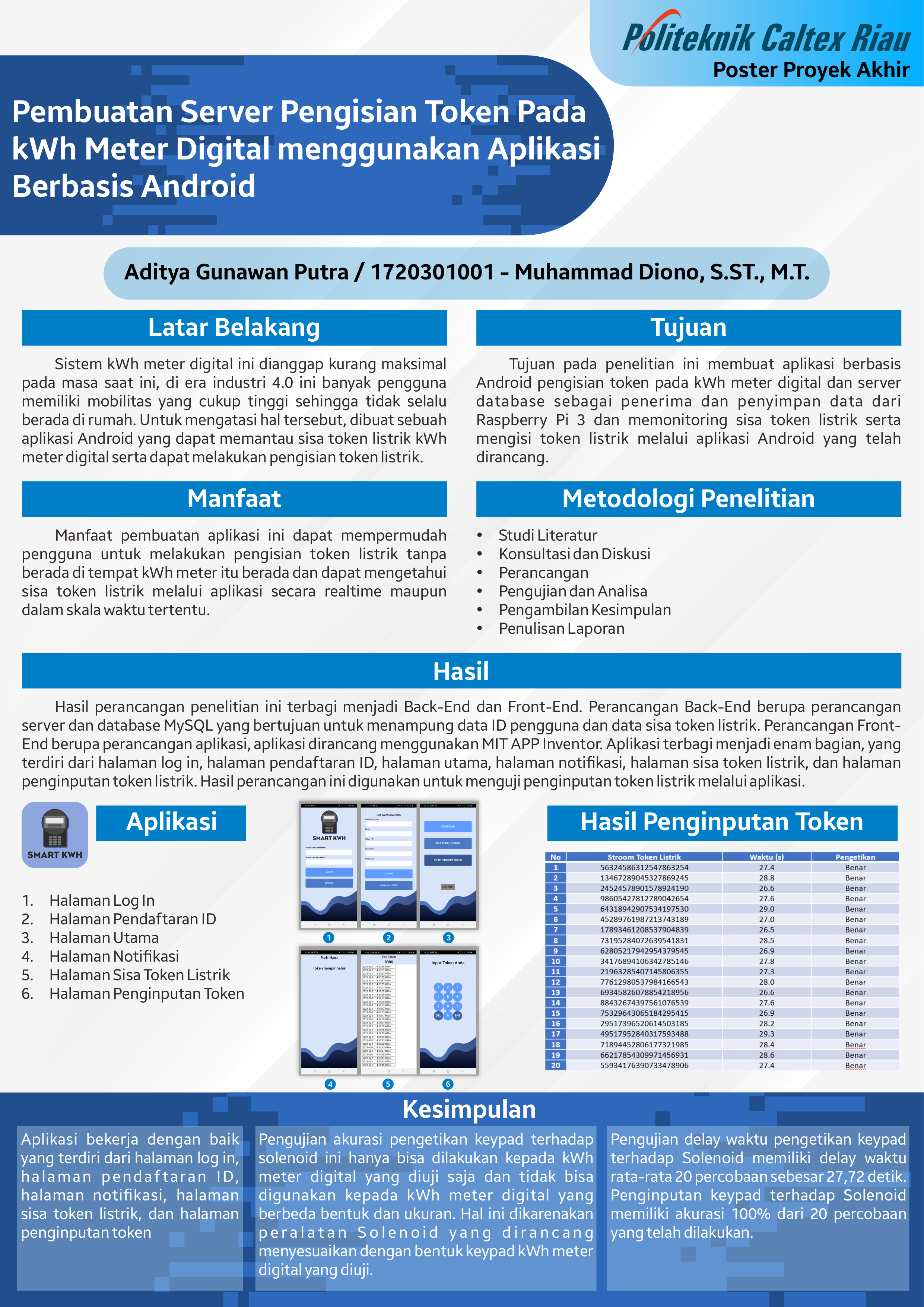 kWh meter merupakan alat yang berfungsi untuk mengukur total energi listrik yang digunakan oleh peralatan yang diambil pada catu daya utama di rumah. Masyarakat saat ini sudah banyak menggunakan kWh meter digital dengan metode pembayaran sistem prabayar. Pada sistem prabayar, pengguna dapat mengisi token listrik dengan stroom token yang telah dibeli melalui ATM atau di loket-loket terdekat. Stroom token ini akan dimasukkan melalui bantuan keypad yang ada di kWh meter digital tersebut. Sistem kWh meter digital ini dianggap kurang maksimal pada masa saat ini, di era industri 4.0 ini banyak pengguna memiliki mobilitas yang cukup tinggi sehingga tidak selalu berada di lingkungan rumah untuk setiap kegiatannya. Untuk mengatasi hal tersebut, dibuat sebuah aplikasi yang dapat memantau sisa token listrik kWh meter digital serta dapat melakukan pengisian token listrik. Metode yang digunakan berupa aplikasi berbasis android yang menggunakan MIT App Inventor sebagai perancangan aplikasinya, lalu server yang digunakan adalah PHP/HTML dan database MySQL untuk menampung data-data yang telah diolah melalui mikrokontroler Raspberry Pi 3. Hasil pengujian pada halaman input stroom token dari keypad memiliki delay waktu rata-rata 27.72 detik terhadap solenoid dan memiliki akurasi pengetikan sebesar 100%.