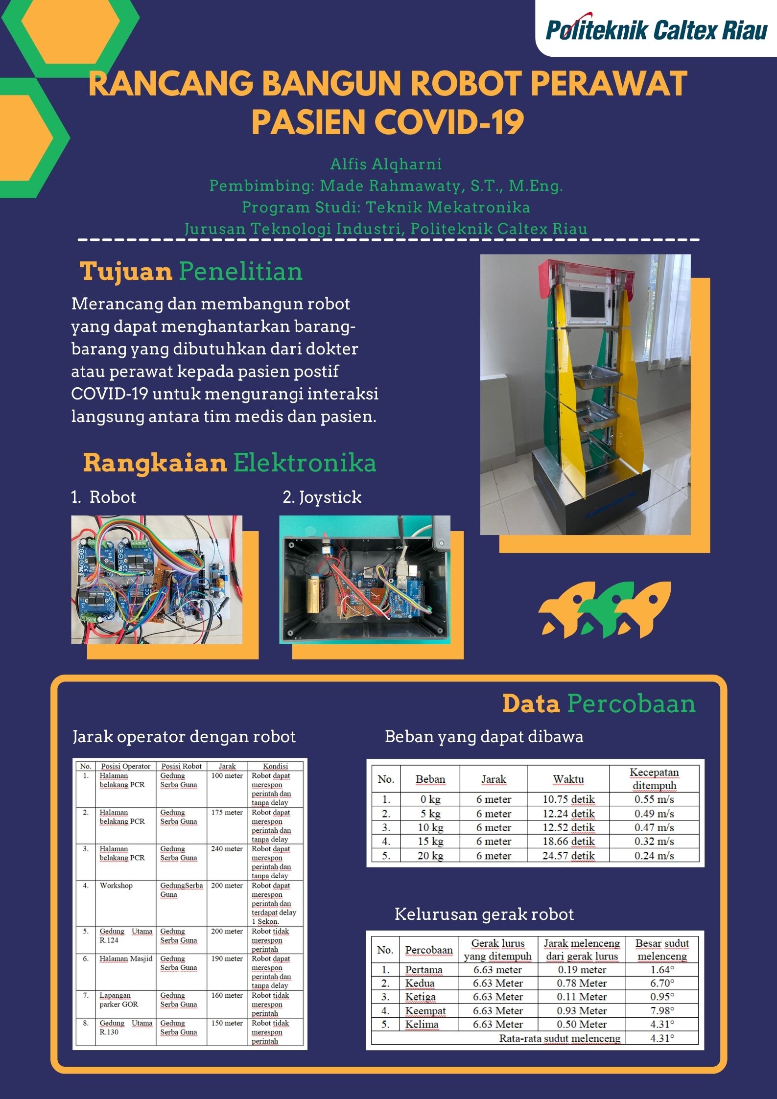 Coronavirus disease 2019 atau disingkat COVID-19 adalah penyakit menular yang disebabkan oleh Severe Acute Respiratory Syndrome Cornavirus 2 (SARS-CoV-2). Penyakit ini muncul pertama kali pada akhir Desember tahun 2019 tepatnya di kota Wuhan, Hubei, China. Pada awalnya penyakit ini hanya tersebar di kota Wuhan, namun seiringnya waktu penyebaran virus mulai meluas ke penjuru negara dan World Health Organization (WHO) menetapkan penyakit ini sebagai pandemik. Namun dikarenakan penyakit ini terus meluas dan sangat cepat penyebarannya banyak tenaga medis yang kewalahan dalam penangannya, sehingga presentase penularan COVID-19 terhadap tenaga medis sangat tinggi. Hal ini dapat diringankan oleh Rancang Bangun Robot Perawat Pasien COVID-19. Robot ini berfungsi untuk mengurangi interaksi tenaga medis dengan pasien COVID-19 dengan cara menghantarkan obat-obatan dan barang yang dibutuhkan dari tenaga medis ke pasien. Dapat dikendalikan wireless dengan jarak jauh hingga 240 meter namun minimal penghalang satu gedung diantaranya. Menggunakan motor DC Power Window sebagai penggerak robot, robot ini dapat menanggung beban maksimum sebesar 20 kg dengan PWM 170, dikarenakan dengan PWM 170 pada motor DC Power Window lebih mudah terkontrol pada saat robot tidak diberi beban. Sudut pelencengan rata-rata dari pergerakan lurus sebesar 4.31°, namun hal ini tidak mempengaruhi besar peforma dari robot tersebut. Menggunakan aki atau akumulator sebanyak 2 unit yang berfungsi sebagai sumber tegangan dengan kapasitas 12 volt disetiap unitnya dan dapat bertahan hingga 3 jam 44 menit dengan waktu pengisian selama kurang lebih 1 jam.