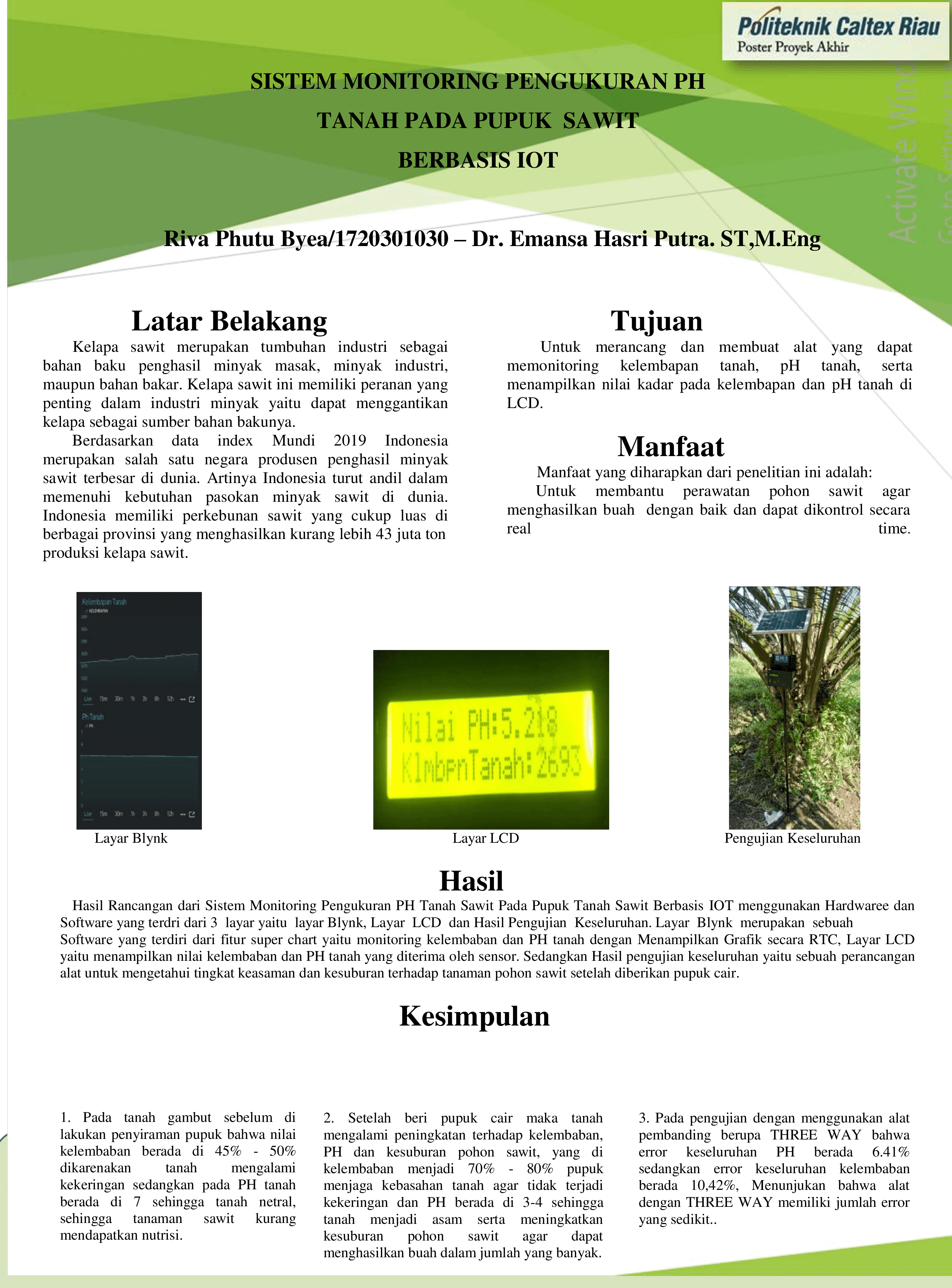 Kelapa sawit merupakan tumbuhan industri sebagai bahan baku penghasil minyak masak, minyak industri, maupun bahan bakar. Kelapa sawit ini memiliki peranan yang penting dalam industri minyak yaitu dapat menggantikan kelapa sebagai sumber bahan bakunya, tetapi tanaman perlu perhatian agar dapat menghasilkan buah dengan baik, maka itu dibuatlah system monitoring pengukuran PH tanah pada pupuk sawit berbasis IoT. System dapat mengetahui kelembaban tanah ,ph tanah, serta menampilkan nilai kadar kelembaban dan ph tanah melalui LCD, sensor yang dipasang dan diteruskan ke smartphone pemilik untuk monitoring tanaman nya melalui aplikasi blynk. Sistem alat sudah menggunakan solar cell 10wp sebagai energy utama dan controller solar cell sebagai untuk mengatur arus masuk ke baterai dan mengambil dari baterai ke beban, dari hasil pengujian dapat menjalankan beban selama +/- 21 jam. Komponen yang diperlukan untuk membangun system iot adalah mikrokontroller, sensor, stepdown, LCD, solar cell, controller solar cell, bms, baterai. Dari hasil pengujian sensor kelembaban memiliki akurasi 75%-80% dan sensor pH tanah memiliki akurasi sebesar 4-6.5.. Dengan adanya system monitoring pengukuran PH tanah pada pupuk sawit berbasis iot agar dapat membantu pemilik tanaman mengetahui kondisi tanah melalui aplikasi blynk serta dapat mengoptimalkan tanaman dengan baik.