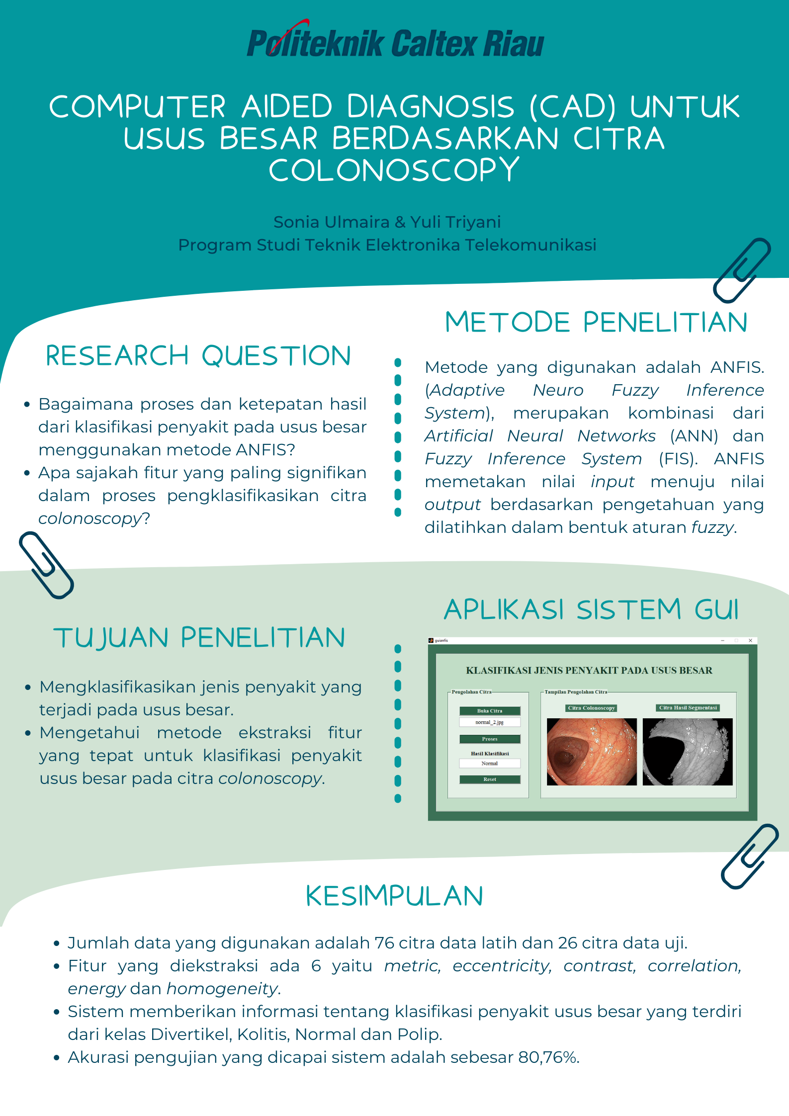 Banyak jenis penyakit dan peradangan yang terjadi pada usus. Di dunia kedokteran, pengambilan tes masih dilakukan secara konvensional yang bisa saja mengalami kesalahan yang akan mempengaruhi diagnosa. Maka dilakukan pembuatan sistem Computer Aided Diagnosis (CAD) untuk dapat mendeteksi dan mengklasifikasikan jenis penyakit pada usus besar dari citra colonoscopy menggunakan metode Adaptive Neuro Fuzzy Inference System (ANFIS) secara cepat dan akurat. Pengklasifikasian dengan ANFIS ini dilakukan dengan mengambil nilai fitur ekstraksi ciri morfologi yaitu metric dan eccentricity dan ciri tekstur GLCM yaitu contrast, correlation, energy dan homogeneity. Keenam ciri tersebut digunakan sebagai masukan dalam algorima ANFIS untuk mengklasifikasikan citra colonoscopy ke dalam 4 buah kelas yaitu Divertikel, Kolitis, Normal dan Polip. Proses klasifikasi dengan ANFIS ini memiliki dua tahap yaitu proses pelatihan dengan menggunakan 76 citra dan proses pengujian dengan 26 citra. Hasil pengujian klasifikasi menggunakan sistem dengan sampel pengujian sebanyak 26 citra diperoleh akurasi sebesar 80,76%.