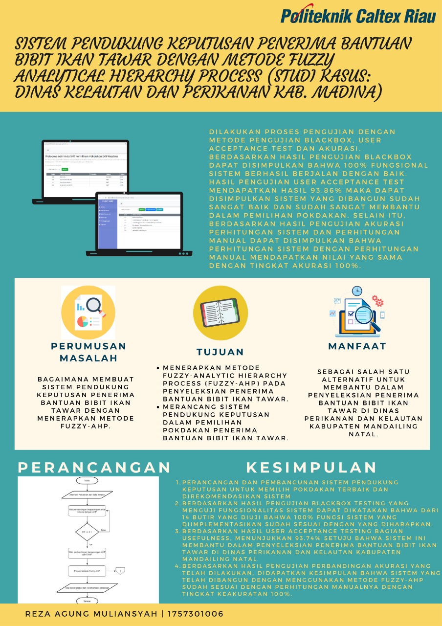 Bantuan adalah segala bentuk pemberian yang didiberikan seseorang kepada individu, kelompok maupun sebaliknya, baik berupa jasa maupun benda yang bermanfaat. Dinas perikanan dan kelautan kabupaten Mandailing Natal memberikan bantuan bibit ikan tawar yang merupakan salah satu strategi pemerintah dalam rangka pelaksanaan prioritas nasional tentang penanggulangan kemiskinan melalui kegiatan program nasional pemberdayaan masyarakat perikanan dan kelautan. Masalah yang sering terjadi pada pemilihan ini adalah masih banyak perkiraan negatif dari Kelompok Pembudidaya Ikan (Pokdakan) seperti adanya pengaruh orang yang bejabatan di Dinas Kelautan dan Perikanan atas pemilihan kelompok sehingga, Dalam proses pemilihan penerima bantuan ini dibutuhkan sebuah sistem pendukung keputusan. Salah satu metode yang dapat digunakan untuk system pendukung keputusan adalah dengan menerapkan metode Fuzzy Analitycal Hierarchy Process (Fuzzy-AHP). Pada penelitian ini akan mencari alternatif terbaik pada kelompok pembudidaya ikan di dinas perikanan dan kelautan kabupaten Mandailing Natal dengan menerapkan metode Fuzzy Analitycal Hirarchy Process berbasis web. Kemudian dilakukan proses pengujian dengan metode pengujian blackbox, user acceptance test dan akurasi. Berdasarkan hasil pengujian blackbox dapat disimpulkan bahwa 100% fungsional sistem berhasil berjalan dengan baik. Hasil pengujian user acceptance test mendapatkan hasil 93.86% maka dapat disimpulkan sistem yang dibangun sudah sangat baik dan sudah sangat membantu dalam pemilihan Pokdakan. Selain itu, berdasarkan hasil pengujian akurasi perhitungan sistem dan perhitungan manual dapat disimpulkan bahwa perhitungan sistem dengan perhitungan manual mendapatkan nilai yang sama dengan tingkat akurasi 100%.