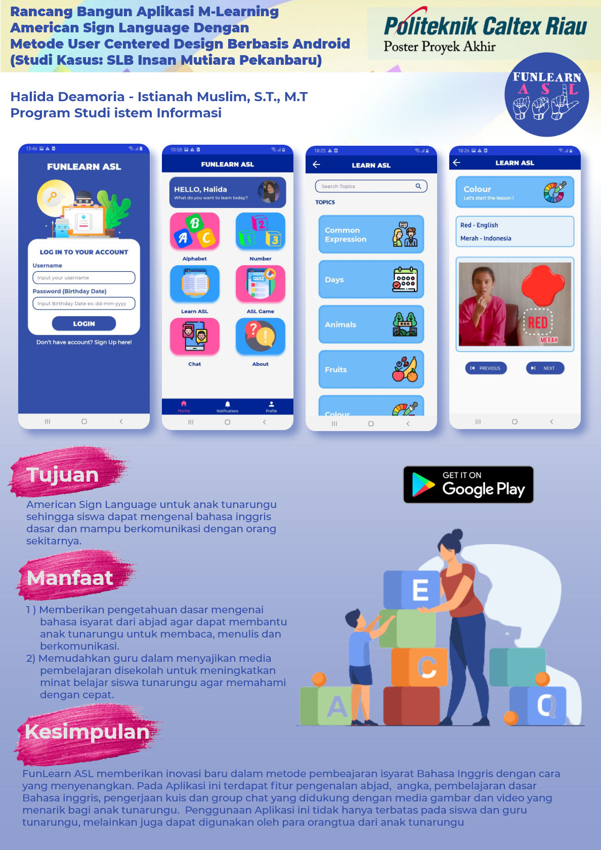 Sekolah ini membutuhkan aplikasi pembelajaran pengenalan dasar bahasa inggris dengan tampilan menarik untuk meningkatkan minat belajar pada anak tunarungu. Aplikasi m-learning FunLearn ASL berbasis android dibangun dengan menggunakan metode User Centered Design (UCD) yang berfokus pada kebutuhan pengguna. Aplikasi ini memiliki fitur pengenalan abjad, angka, pembelajaran dasar bahasa inggris menggunakan multimedia gambar dan video, chat dan
