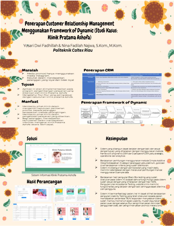 Teknologi informasi yang berkualitas dan mampu memenuhi kebutuhan digunakan untuk pengaksesan dan pemrosesan informasi yang lebih efektif dan efisien, salah satunya terletak pada teknologi yang dibutuhkan oleh klinik Pratama Ashofa. Klinik Pratama Ashofa merupakan klinik kecantikan. Klinik masih melakukan pencatatan data layanan pelanggan secara manual dan penurunan tingkat kedatangan pelanggan berulang. Upaya meningkatkan inovasi nilai kepada pelanggan untuk memenuhi kebutuhan perlu dilakukan penerapan teknologi informasi yaitu Customer Relationship Management menggunakan framework of dynamic sebagai salah satu fitur yang terdapat dalam CRM, untuk memperoleh infomasi kepuasan pelanggan yang memiliki loyalitas. Pemanfaatan data pelanggan akan diolah menjadi 3 kategori yaitu platinum, gold dan silver menggunakan perangkingan sistem pengambilan keputusan dengan metode Simple Additive Weighting. Proses perangkingan pelanggan melalui normalisasi suatu matriks keputusan. Hasil matriks keputusan yang diperoleh nilai tertinggi pelanggan berdasarkan kriteria adalah 1 dan terendah adalah 0.27. Pengujian yang telah dilakukan adalah pengujian blacbox testing didapatkan bahwa 100% fungsionalitas sistem berjalan dengan baik dan pengujian UAT, mendapatkan hasil bahwa semua fitur berjalan dengan baik. Pengujian Usability Testing yang diterapkan kepada pasien didapatkan persentase 78,1% dengan arti klinik memberikan penilaian setuju terhadap sistem customer relationship management Klinik Pratama Ashofa.