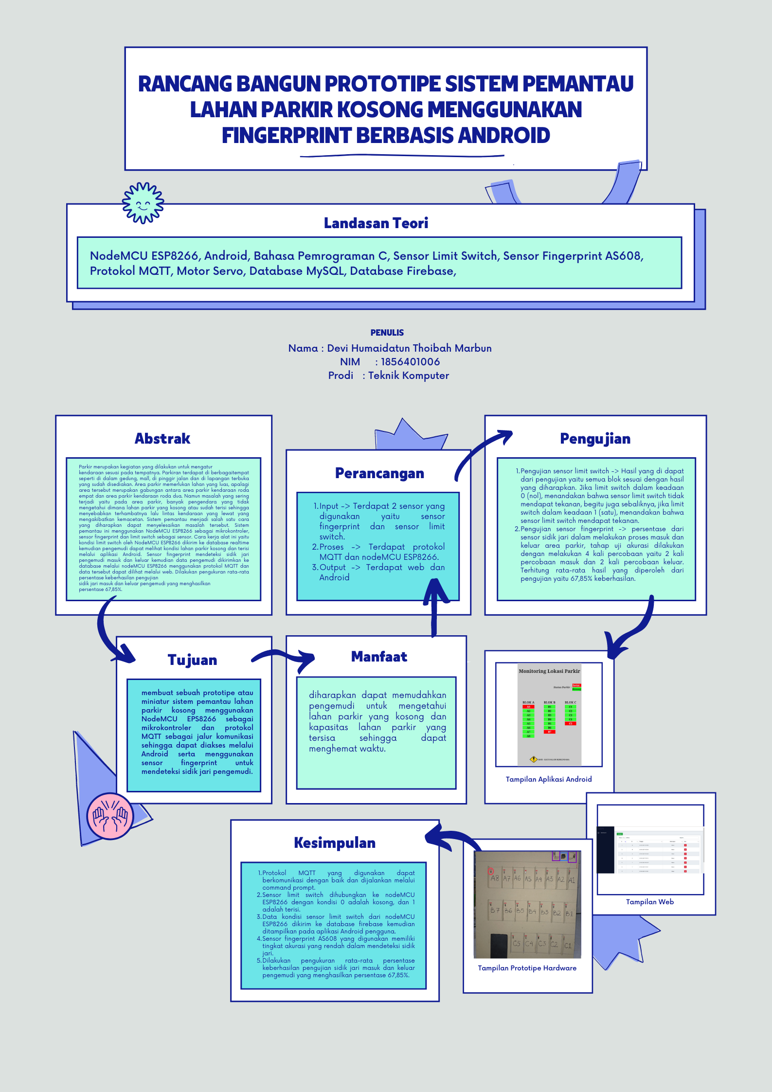Parkir merupakan kegiatan yang dilakukan untuk mengatur kendaraan sesuai pada tempatnya. Parkiran terdapat di berbagai tempat seperti di dalam gedung, mall, di pinggir jalan dan di lapangan terbuka yang sudah disediakan. Area parkir memerlukan lahan yang luas, apalagi area tersebut merupakan gabungan antara area parkir kendaraan roda empat dan area parkir kendaraan roda dua. Namun masalah yang sering terjadi yaitu pada area parkir, banyak pengendara yang tidak mengetahui dimana lahan parkir yang kosong atau sudah terisi sehingga menyebabkan terhambatnya lalu lintas kendaraan yang lewat yang mengakibatkan kemacetan. Sistem pemantau menjadi salah satu cara yang diharapkan dapat menyelesaikan masalah tersebut. Sistem pemantau ini menggunakan NodeMCU ESP8266 sebagai mikrokontroler, sensor fingerprint dan limit switch sebagai sensor. Cara kerja alat ini yaitu kondisi limit switch oleh NodeMCU ESP8266 dikirim ke database realtime kemudian pengemudi dapat melihat kondisi lahan parkir kosong dan terisi melalui aplikasi Android. Sensor fingerprint mendeteksi sidik jari pengemudi masuk dan keluar kemudian data pengemudi dikirimkan ke database melalui nodeMCU ESP8266 menggunakan protokol MQTT dan data tersebut dapat dilihat melalui web. Dilakukan pengukuran rata-rata persentase keberhasilan pengujian sidik jari masuk dan keluar pengemudi yang menghasilkan persentase 67,85%.