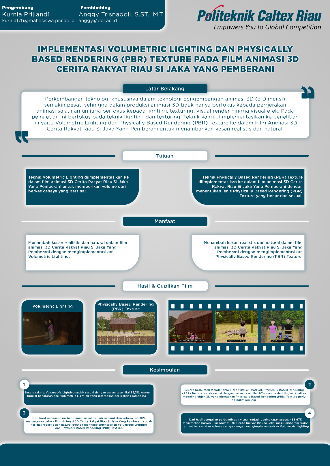 Teknik Volumetric Lighting merupakan teknik yang dapat diterapkan pada produksi film animasi 3D yang bertujuan untuk memberikan volume berkas cahaya. Teknik Physically Based Rendering (PBR) Texture merupakan teknik yang dapat diterapkan pada produksi film animasi 3D yang bertujuan untuk memberikan kesan realistis dan natural dari tekstur yang diberikan pada objek 3D Teknik Volumetric Lighting dan Teknik Physically Based Rendering (PBR) Texture diterapkan ke dalam film animasi 3D cerita rakyat Riau Si Jaka Yang Pemberani. Berdasarkan hasil pengujian dan analisis ke ahli, didapatkan hasil bahwa teknik Volumetric Lighting dan teknik Physically Based Rendering (PBR) Texture secara basic sudah sesuai diterapkan, namun dari tingkat kehalusan Volumetric Lighting dan tingkat kualitas modeling objek 3D yang diterapkan harus ditingkatkan lagi. Film Animasi 3D Cerita Rakyat Riau Si Jaka Yang Pemberani sudah terlihat realistis dan natural dengan mengimplementasikan Volumetric Lighting dan Physically Based Rendering (PBR) Texture, dengan peningkatan nilai sebesar 33,30% dari hasil pengujian perbandingan visual yang dilakukan oleh 30 responden. Film Animasi 3D Cerita Rakyat Riau Si Jaka Yang Pemberani juga sudah terlihat seperti ada volume atau berkas cahaya yang bersinar dengan mengimplementasikan Volumetric Lighting yang mengalami peningkatan nilai sebesar 66,6% dari hasil pengujian perbandingan visual yang dilakukan oleh 30 responden.