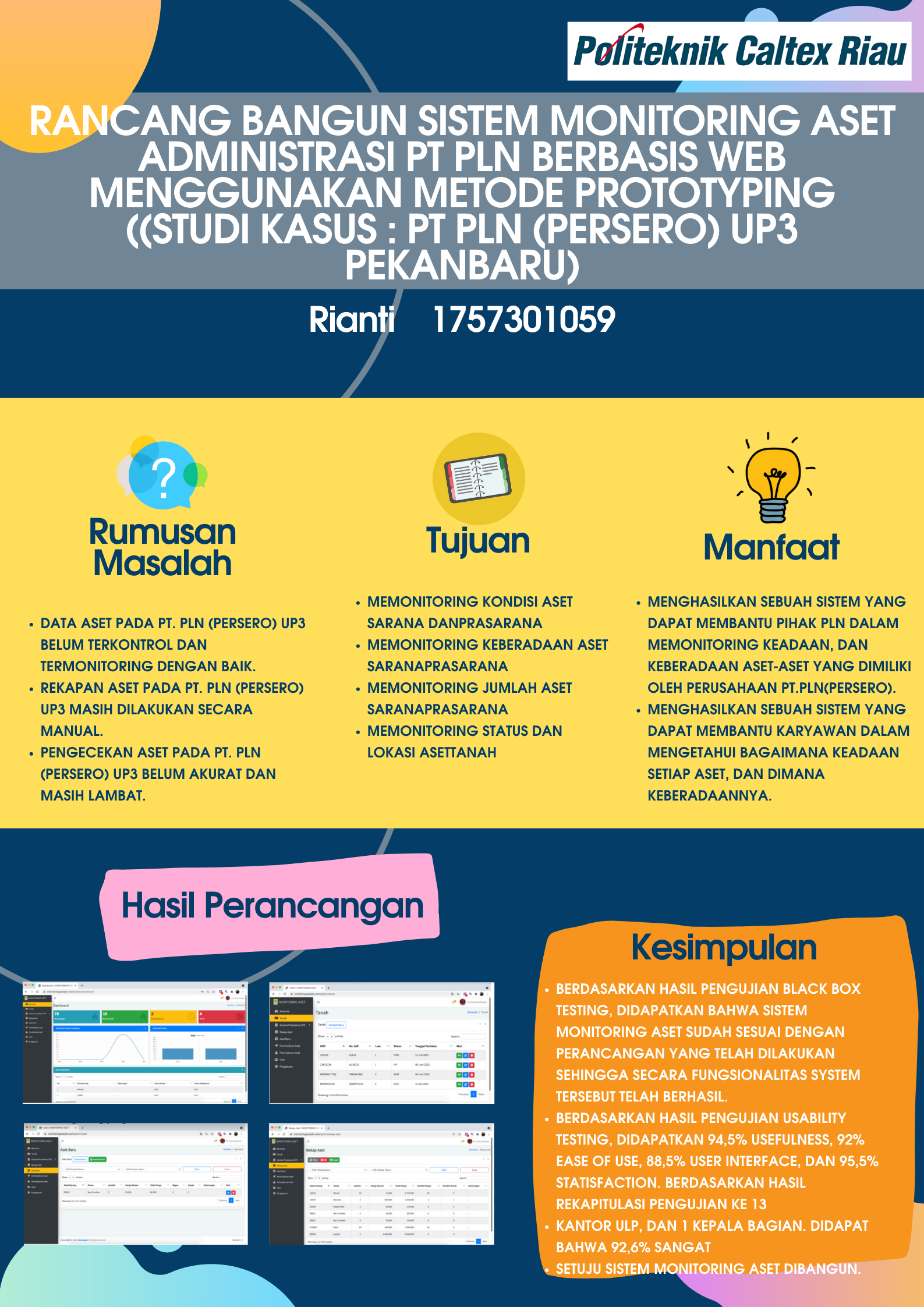 PT. PLN(Persero) UP3 Pekanbaru Merupakan Unit terbesar dan menjadi kantor induk, dengan membawahi dan mengawasi kinerja 13 kantor ULP yang ada di wilayah Riau. Sebagai kantor induk, PT. PLN UP3 memiliki banyak aset tanah dan aset-aset sarana prasarana, namun aset-aset tersebut tidak di buku kan dan tidak terkoordinasi dengan baik, sehingga menyebab kan banyak aset yang hilang dan tidak tau kemana arah aset tersebut. Pengecekan aset-aset dilakukan dengan cara melihat langsung ke setiap tempat dan data tidak dibukukan, sehingga disaat aset ingin digunakan ternyata rusak atau hilang karena tidak adanya catatan mengenai kondisi barang yang baik, rusak, di pinjam bahkan hilang. Maka berdasarkan hasil wawancara dengan Bapak Usman selaku Supervisor bagian administrasi PT.PLN(Persero) UP3 Pekanbaru bahwasan nya mereka sangat membutuhkan sebuah sistem agar dapat memonitoring seluruh aset yang ada di PLN dengan mudah. Dengan adanya sistem ini, karyawan bagian pengelola aset merasa sangat terbantu dalam mengelola aset dengan cepat dan mudah. Untuk Usability Testing dilakukan dengan 13 kantor ULP dan 1 kepala bagian, didapatlah hasil 92,6% pengguna sangat setuju. Sistem yang mudah digunakan, tampilan yang menarik, dan informasi aset yang akurat, membuat admin setuju dengan adanya sistem ini