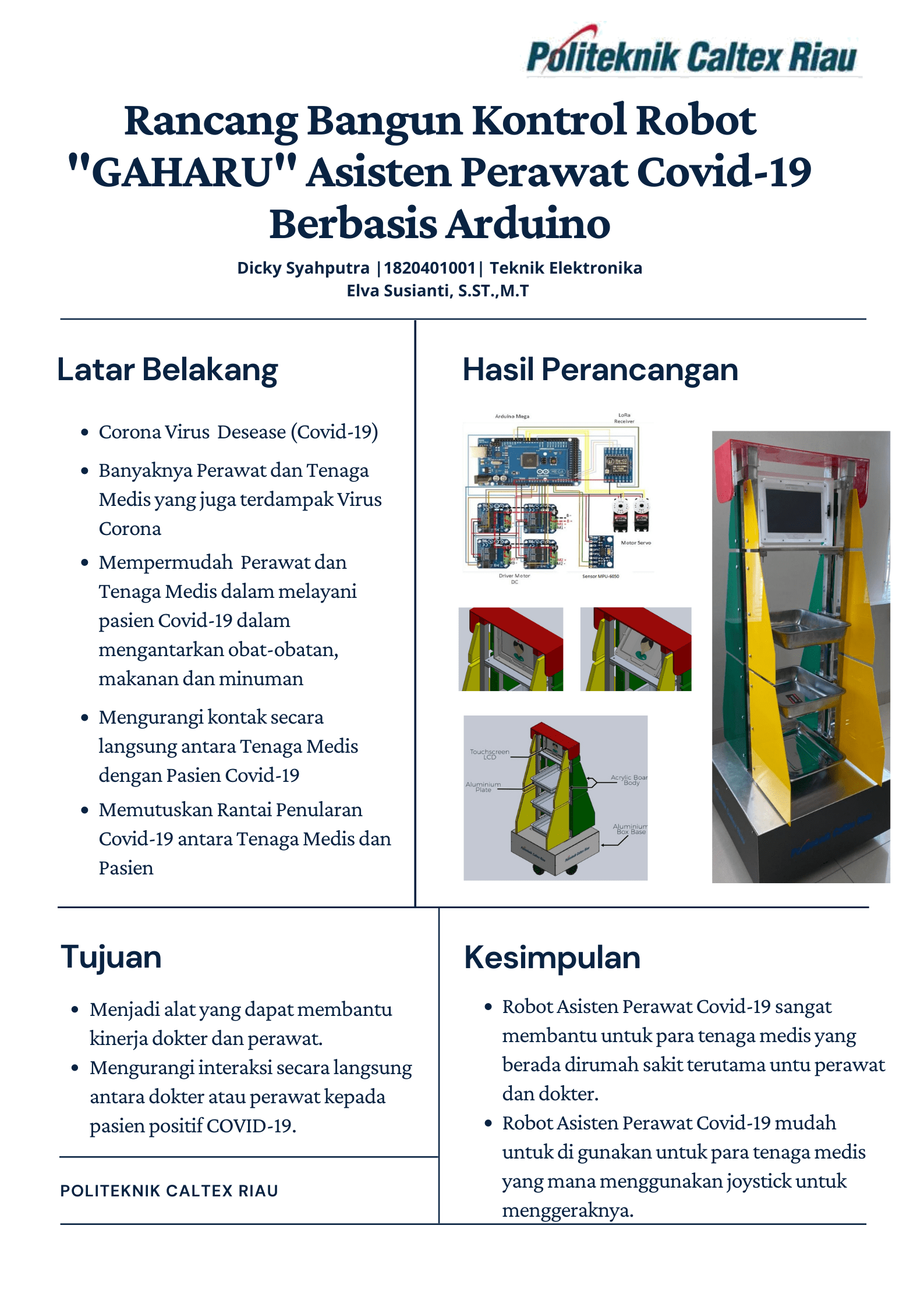 Coronavirus disease 2019 atau disingkat COVID-19 adalah penyakit menular yang disebabkan oleh Severe Acute Respiratory Syndrome Cornavirus 2 (SARS-CoV-2). Penyakit ini muncul pertama kali muncul pada akhir Desember tahun 2019 tepatnya di kota Wuhan, Hubei, China. Hingga tahun 2021 saat ini kasus COVID-19 masih terus bertambah. Dikaren akan penyakit ini terus meluas dan sangat cepat penyebarannya banyak tenaga medis yang kewalahan dalam penangannya, sehingga presentase penularan COVID-19 terhadap tenaga medis sangat tinggi. Yang mana hingga februari 2021 ini kasus COVID-19 di dunia sudah mencapai 104 juta kasus, sedangkan di Indonesia sudah mencapai 1 juta kasus dan di pekanbaru sudah mencapai 71 ribu kasus. Hal ini dapat diringankan oleh Robot Perawat Pasien COVID-19. Robot ini memudahkan tenaga medis dalam memberikan pelayanan kepada pasien dengan menghantarkan makanan, obat-obatan, dan barang-barang yang dibutuhkan tanpa harus kontak langsung dengan pasien tersebut. Dengan dikendalikan melalui joystick, dan menggunakan modul lora robot ini dapat menghantarkan barang yang dibutuhkan melalui jarak jauh dari tim medis hingga sampai ke pasien. Dilengkapi oleh komputer tablet yang memudahkan komunikasi antara pasien dan tim medis melalui video call. Terdiri dari empat rak aluminium yang dapat memuat barang hingga 30 kilogram. Dengan robot ini diharapkan dapat membantu tenaga medis dalam melayani pasien COVID-19 dan mengurangi presantase penularan virus hingga 50%.