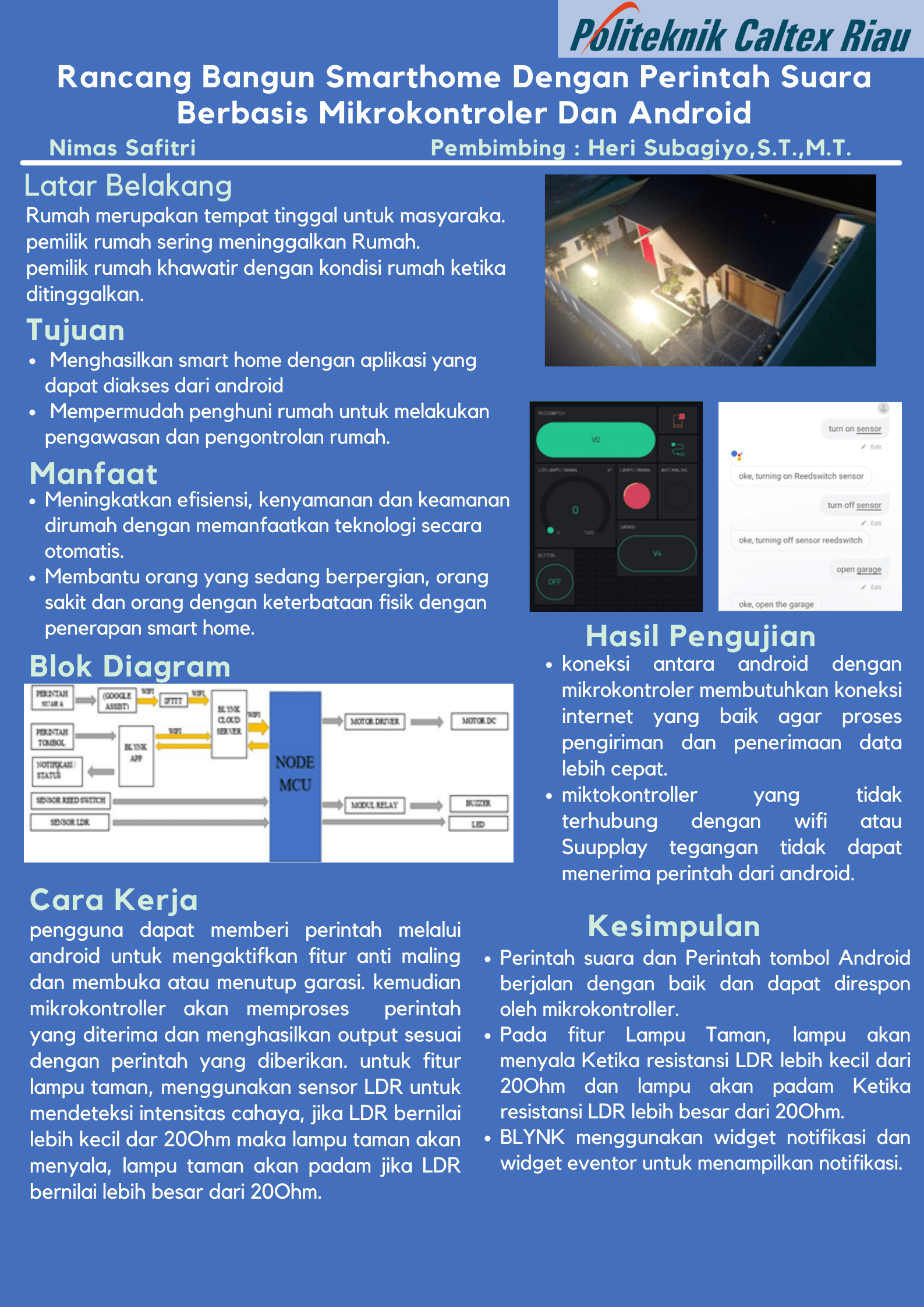 Rumah merupakan bangunan tempat tinggal masyarakat, namun masyarakat sering meninggalkan rumah dengan waktu tertentu untuk beraktivitas diluar rumah. Penghuni rumah mengalami kesulitan untuk mengawasi keamanan/ kelistrikan dirumah ketika meninggalkan rumah. Oleh karena itu pada proyek akhir ini dilakukan rancang bangun miniatur smarthome dengan beberapa fitur yang bisa dikontrol dan diawasi dari jarak jauh melalui aplikasi pada smartphone. Adapun fitur-fitur yang diterapkan pada smarthome ini, ialah fitur Garasi dengan input perintah suara/perintah tombol untuk membuka atau menutup garasi, Fitur Anti Maling dengan input kondisi sensor magnetic dan perintah suara/perintah tombol untuk mengaktifkan dan menonaktifkan sensor. Fitur Lampu Taman menggunakan input sensor LDR untuk menyalakan/memadamkan lampu. Keseluruhan kerja fitur-fitur pada smarthome ini diatur oleh NodeMCU sebagai mikrokontrollernya. Hasil pengujian ini menunjukkan bahwa Perintah suara dan perintah tombol dapat mengontrol fitur garasi dan fitur anti maling. Perintah suara dan perintah tombol dapat diterjemahkan dan diproses oleh mikrokontroller sehingga mampu menghasilkan output sesuai dengan yang diharapkan. Fitur anti maling berhasil menampilkan notifikasi Ketika sensor aktif dan tidak mendeteksi adanya magnet. Fitur lampu taman berhasil menyalakan dan memadamkan lampu taman serta android berhasil menampilkan notifikasi ketika terjadi perubahan kondisi lampu taman.