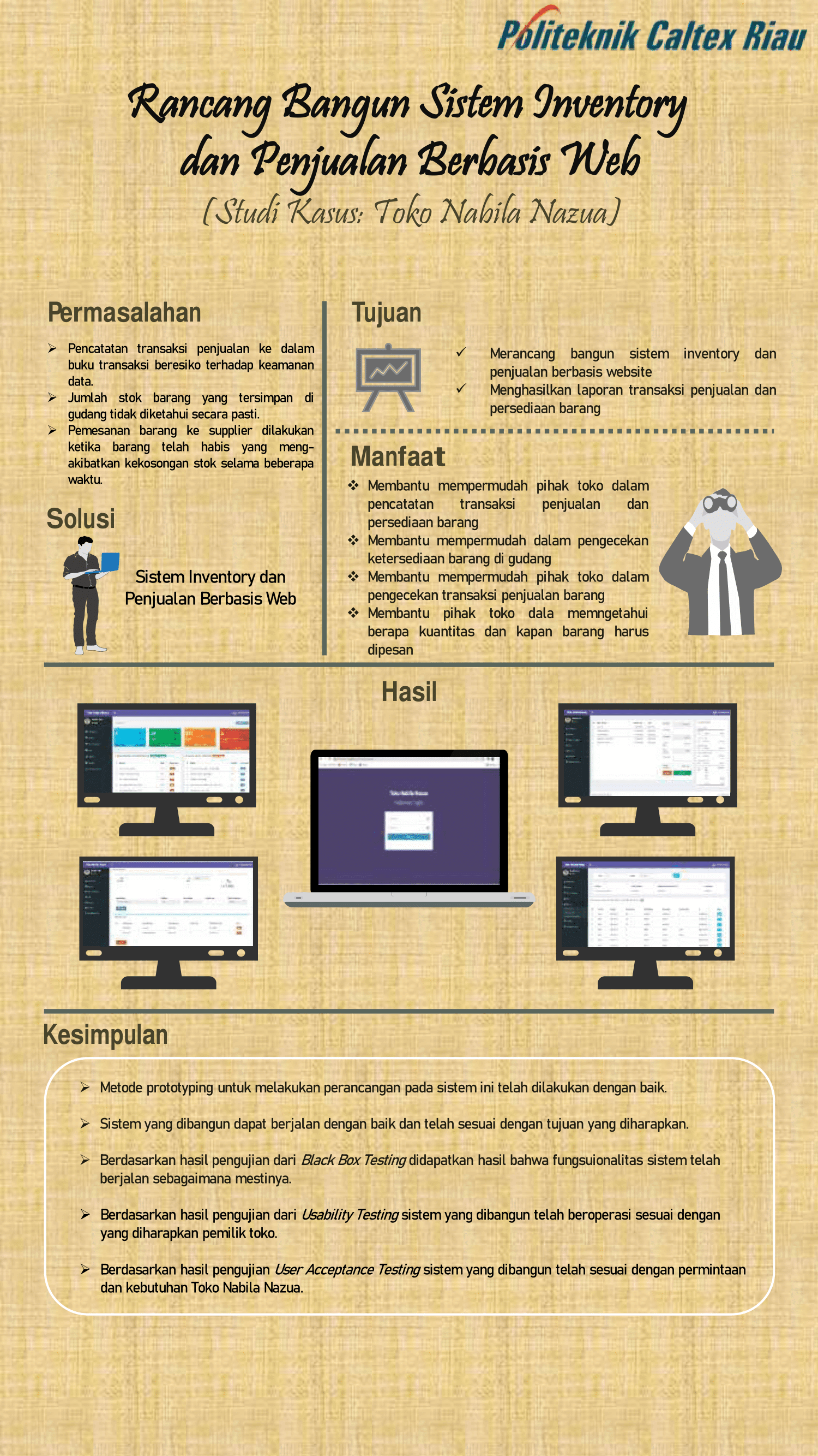 Toko Nabila Nazua bergerak di bidang retail, dalam aktivitas bisnisnya menjual kebutuhan harian dan kebutuhan pokok. Dalam melakukan transakasi penjualan, Toko Nabila Nazua melakukan pencatatan transaksi ke dalam buku transaksi penjualan, yang tentu saja hal ini tidak efektif dan beresiko terhadap kerusakan data. Kemudian dalam pengecekan stok barang dilakukan dengan mengecek langsung ke gudang, hal ini akan memakan waktu yang cukup lama. Kekosongan stok barang di gudang sering terjadi karena pemilik toko tidak tahu pasti jumlah barang yang harus dipesan dan kapan waktu yang tepat untuk melakukan pemesanan barang. Oleh karena itu Toko Nabila Nazua membutuhkan sebuah sistem yang dapat membantu menangani permasalahan tersebut. Maka dibangunlah sebuah sistem inventory dan penjualan berbasis website dengan menggunakan metode perhitungan Economic Order Quantity. Metode ini menentukan jumlah pemesanan barang yang efisien sehingga meminimalisir kekurangan dan kelebihan stok. Untuk menentukan kapan pemesanan harus dilakukan menggunakan metode Reorder Point. Pengujian yang telah dilakukan adalah pengujian Blacbox Testing didapatkan bahwa 100% fungsionalitas sistem berjalan dengan baik dan pengujian UAT mendapatkan hasil bahwa semua fitur berjalan dengan baik. Pengujian Usability Testing yang diterapkan kepada pemilik toko dan pegawai didapatkan persentase 96,87% dengan arti responden memberikan penilaian sangat setuju terhadap sistem inventory dan penjualan Toko Nabila Nazua.