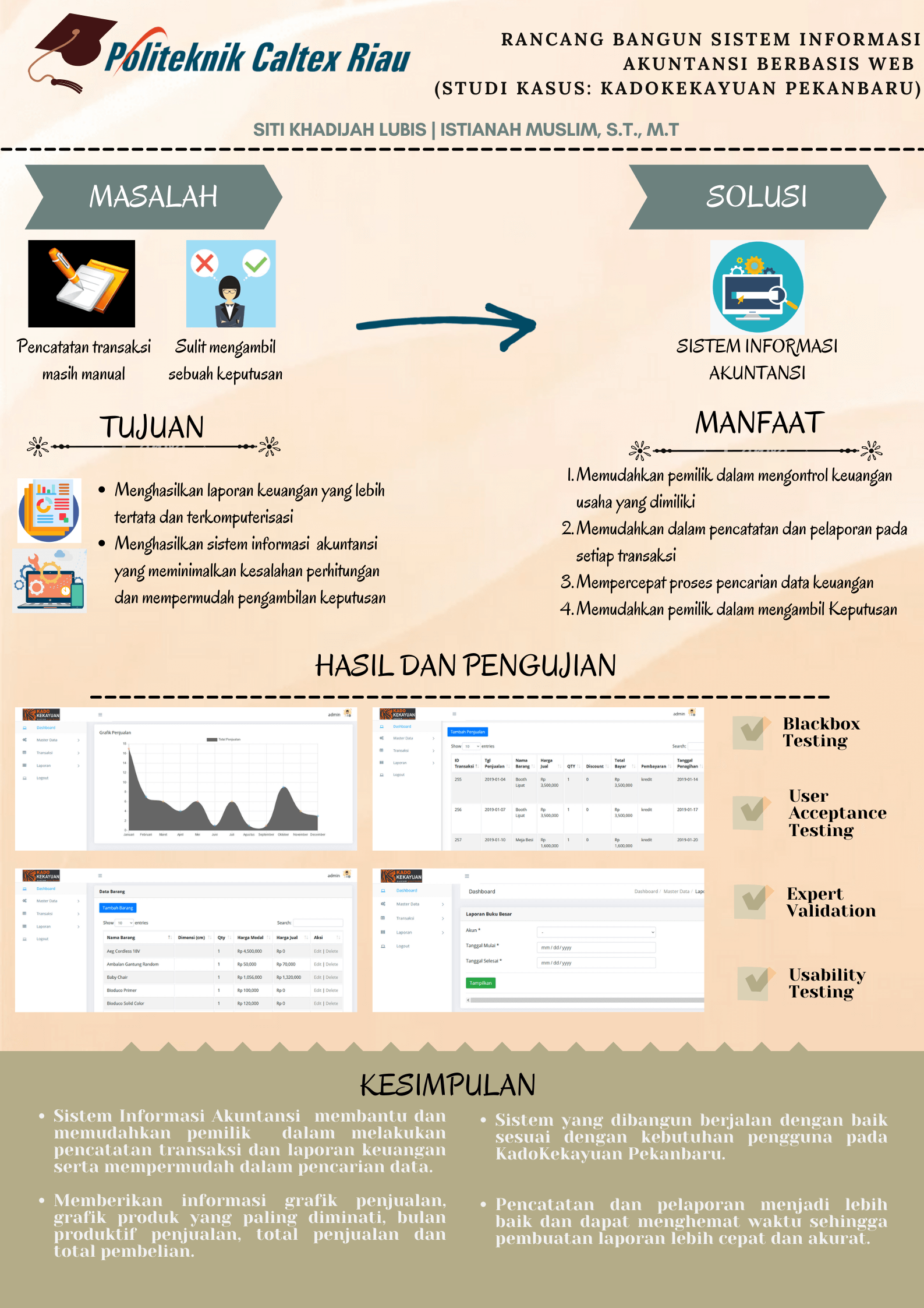 KadoKekayuan Pekanbaru merupakan salah satu usaha kecil dan menengah (UKM) dan salah satu perusahaan manufaktur yang menghasilkan berbagai produk dari kayu. Usaha KadoKekayuan ini masih melakukan pencatatan keuangan secara manual. Akibat pencatatan transaksi manual mengakibatkan seperti, mempengaruhi time respon dalam memenuhi kebutuhan barang, persentase kasbon dengan kerjaan yang tidak balance, kesulitan dalam mengakses dan sulit mengambil keputusan. Berdasarkan permasalahan yang ada maka dibangun Sistem Informasi Akuntansi untuk mendukung kegiatan bisnis dari KadoKekayuan Pekanbaru. Sistem informasi akuntansi ini dibangun dengan menggunakan metode prototyping. Metode ini memberikan kemudahan dalam pengembangan sistem dan dapat memahami keinginan pengguna dalam mengungkapkan kebutuhannya. Dengan adanya sistem ini, pencatatan transaksi menjadi lebih mudah sehingga pembuatan laporan keuangan langsung dapat tergarap secara otomatis. Sistem ini diuji oleh praktisi akuntansi dengan hasil pengujian menyatakan bahwa sistem yang dihasilkan sudah sesuai dengan siklus akuntansi sebagaimana mestinya. Pengujian lain yang dilakukan adalah pengujian Black Box Testing dengan hasil 100% dengan 81 butir uji, User Acceptance Testing (UAT) dan Usability Testing. Pengujian User Acceptance Testing (UAT) Kuesioner didapatkan hasil 90% dengan pengujian sebanyak 3 responden yang menandakan sistem ini sudah memenuhi sesuai keinginan pengguna. Dan pengujian Usability Testing didapatkan hasil sebesar 89, yang menandakan sistem ini Acceptable.