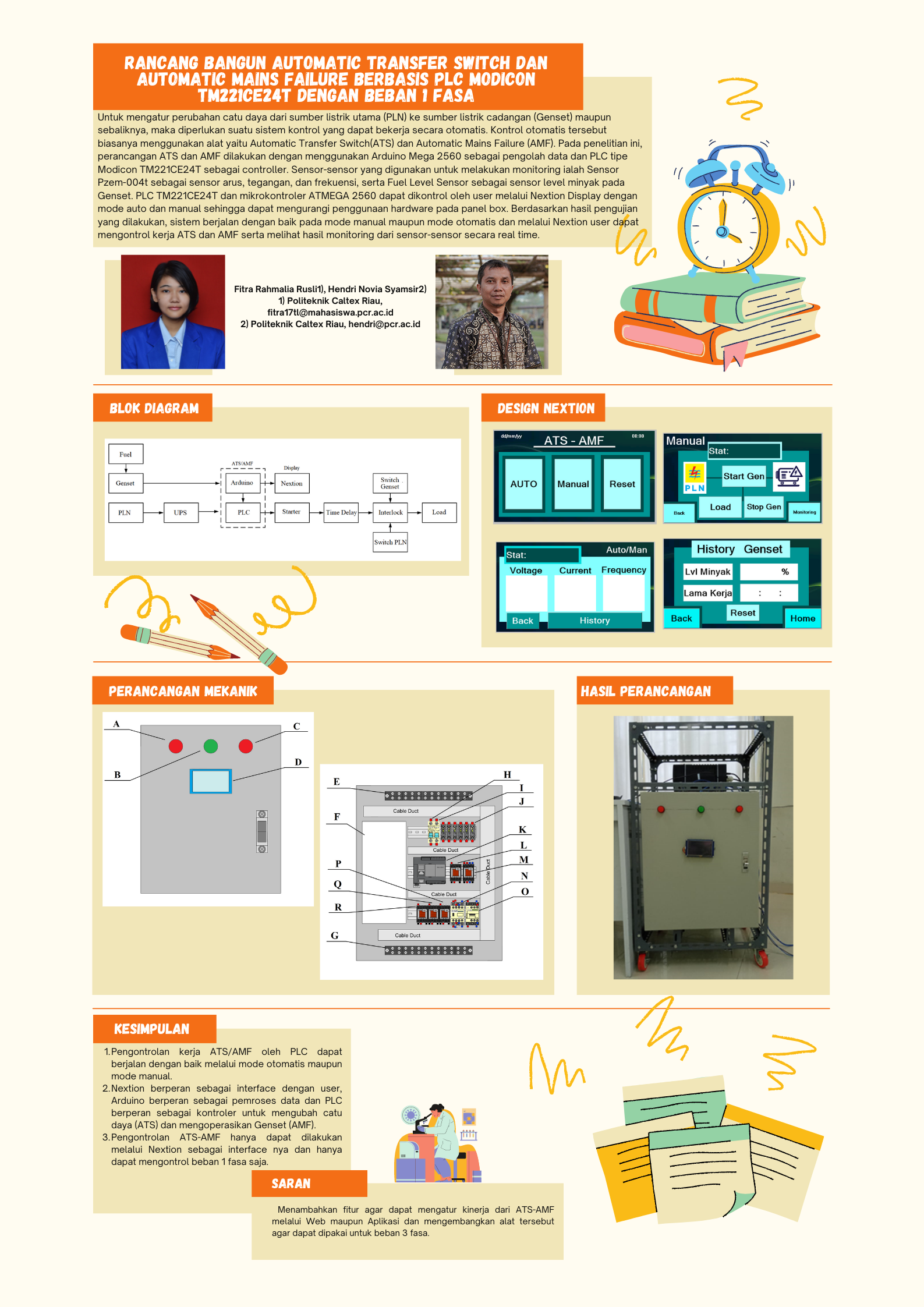 Untuk mengatur perubahan catu daya dari sumber listrik utama (PLN) ke sumber listrik cadangan (Genset) maupun sebaliknya, maka diperlukan suatu sistem kontrol yang dapat bekerja secara otomatis. Kontrol otomatis tersebut biasanya menggunakan alat yaitu Automatic Transfer Switch(ATS) dan Automatic Mains Failure (AMF). Pada penelitian ini, perancangan ATS dan AMF dilakukan dengan menggunakan Arduino Mega 2560 sebagai pengolah data dan PLC tipe Modicon TM221CE24T sebagai controller. Sensor-sensor yang digunakan untuk melakukan monitoring ialah Sensor Pzem-004t sebagai sensor arus, tegangan, dan frekuensi, serta Fuel Level Sensor sebagai sensor level minyak pada Genset. PLC TM221CE24T dan mikrokontroler ATMEGA 2560 dapat dikontrol oleh user melalui Nextion Display dengan mode auto dan manual sehingga dapat mengurangi penggunaan hardware pada panel box. Berdasarkan hasil pengujian yang dilakukan, waktu perpindahan rata-rata pada mode manual ialah 1.3 detik dan waktu perpindahan rata-rata pada mode otomatis ialah 15.3 detik dan melalui Nextion user dapat mengontrol kerja ATS dan AMF serta melihat hasil monitoring dari sensor-sensor secara real time.