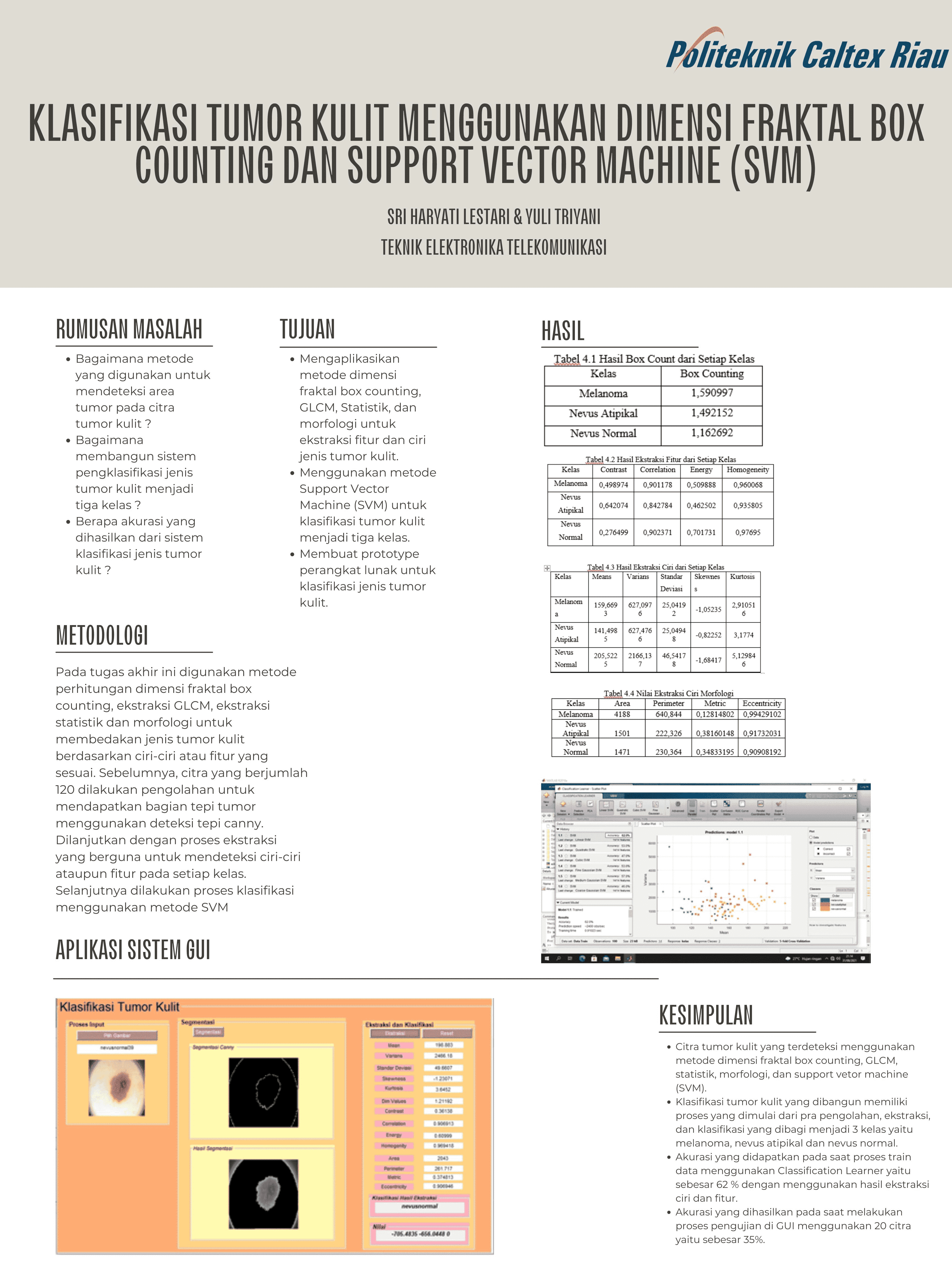 Kanker kulit merupakan salah satu penyakit yang tumbuh seperti benjolan atau pertumbuhan jaringan kulit yang berlebihan sehingga akan mengenai sebagian atau seluruh permukaan kulit. Namun, pada dasarnya kanker kulit merupakan bagian dari tumor kulit yang bersifat ganas contohnya melanoma. Pada jenis tumor kulit yang bersifat jinak contoh nya nevus atipikal. Dari contoh tumor jinak dan ganas dapat di bedakan berdasarkan ciri-ciri nya. Ciri-ciri yang dimaksud salah satunya bentuk dari tumor dan pembatas antara tumor dengan kulit yang dimaksud sebagai border. Pada tugas akhir ini digunakan metode perhitungan dimensi fraktal box counting, ekstraksi GLCM, ekstraksi statistik dan morfologi untuk membedakan jenis tumor kulit berdasarkan ciri-ciri atau fitur yang sesuai. Sebelumnya, citra yang berjumlah 120 dilakukan pengolahan untuk mendapatkan bagian tepi tumor menggunakan deteksi tepi canny. Dilanjutkan dengan proses ekstraksi yang berguna untuk mendeteksi ciri-ciri ataupun fitur pada setiap kelas. Selanjutnya dilakukan proses klasifikasi menggunakan metode SVM. Dari hasil klasifikasi dengan menggunakan Classification Learner didapatkan akurasi sebesar 62% menggunakan 100 citra masukan yang sudah diekstraksi. Pada saat melakukan pengujian di GUI menggunakan 20 citra didapatkan akurasi sebesar 35%.